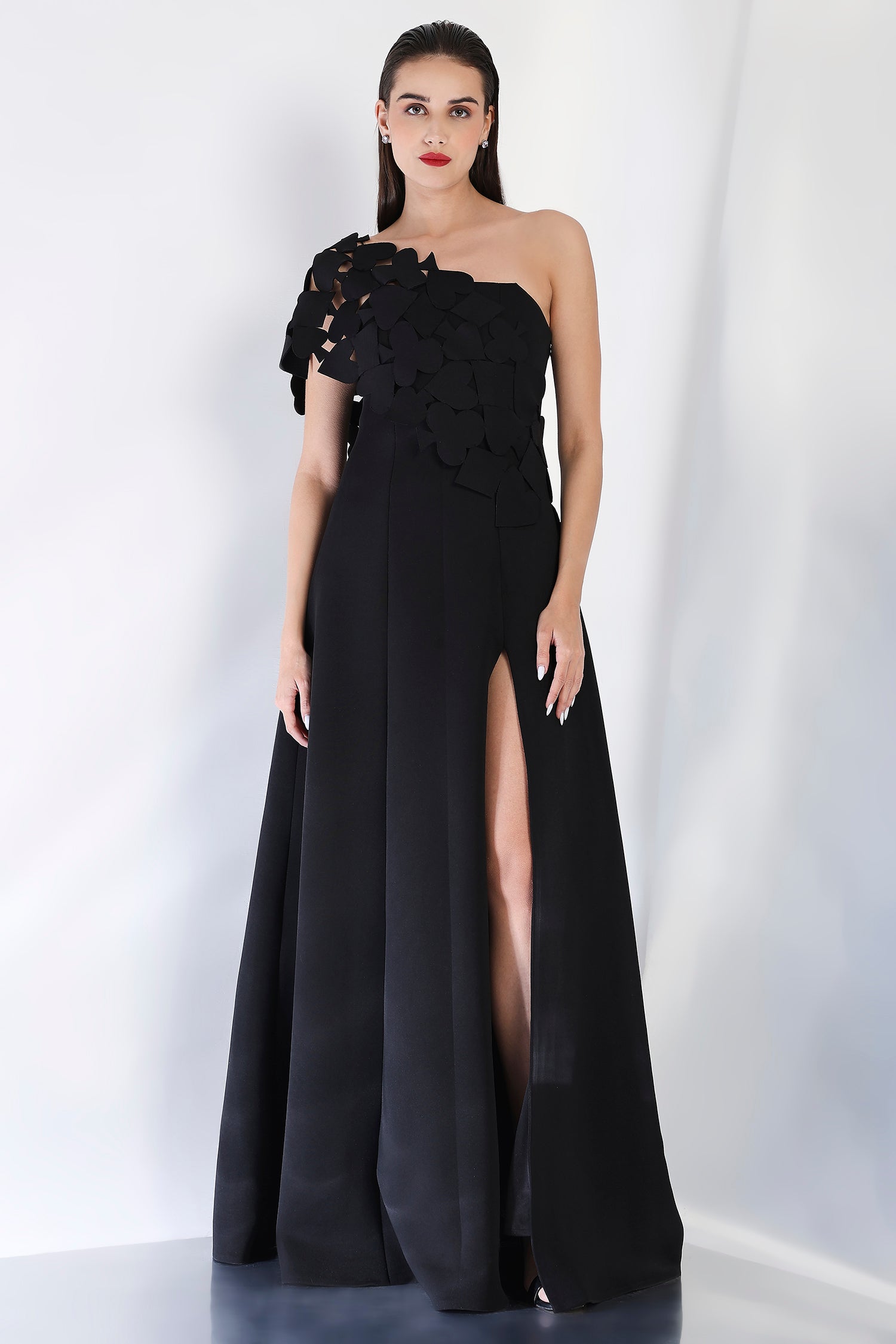 Designed for the modern fashionista, this strapless panel dress with a front slit creates an elegantly sleek shape. The ace cutout wrap, which can be styled as one-shoulder or off-shoulder, adds a contemporary edge to this sophisticated piece, making it perfect for an evening out or any formal gathering where style and poise are paramount.
