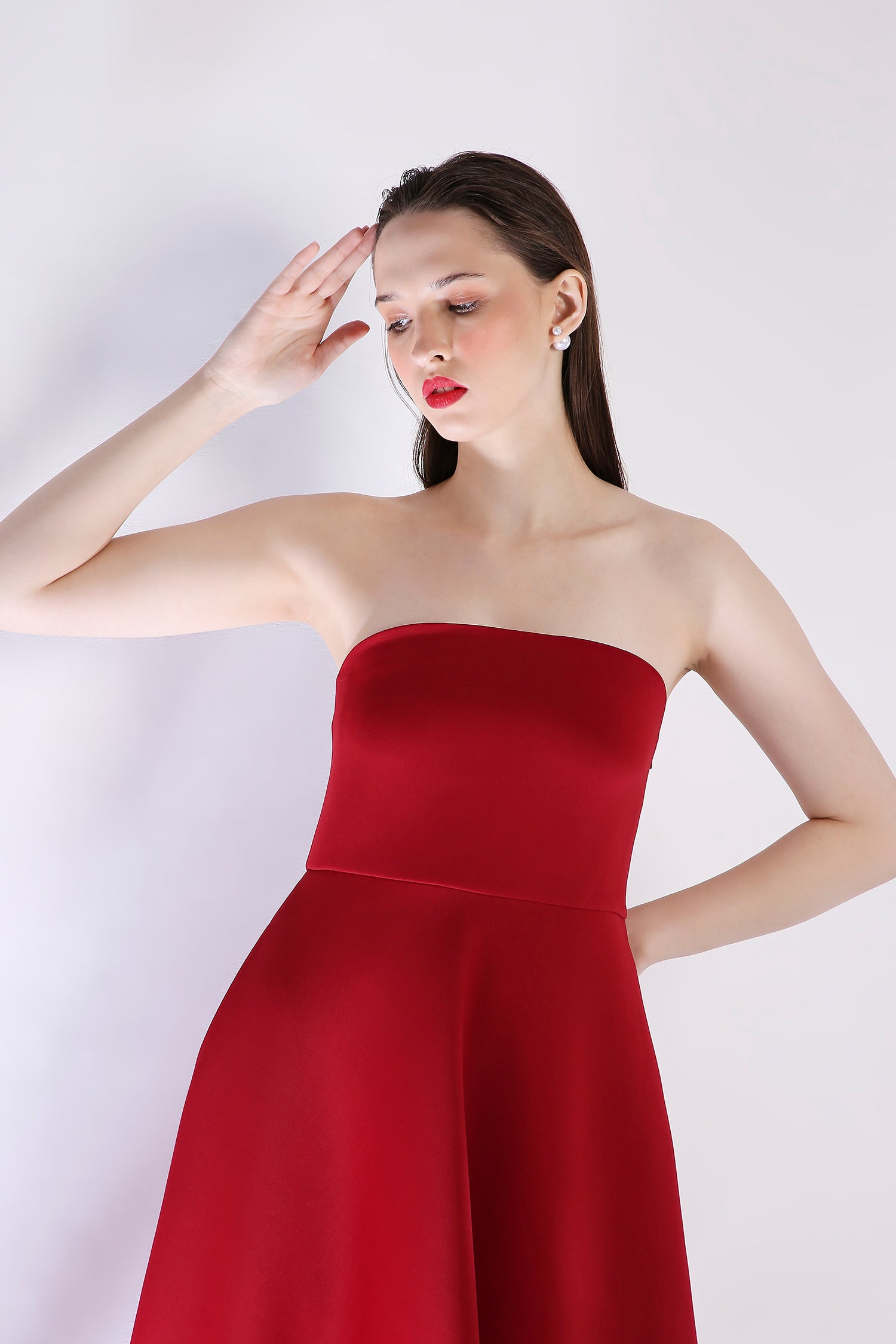 Meet the Juliette dress—a captivating strapless design in deep red, featuring delicate floral appliqué cutouts along the hem. With its soft floral print and refined cutout detailing, this dress exudes romance and elegance, making it an unforgettable choice for any special occasion.