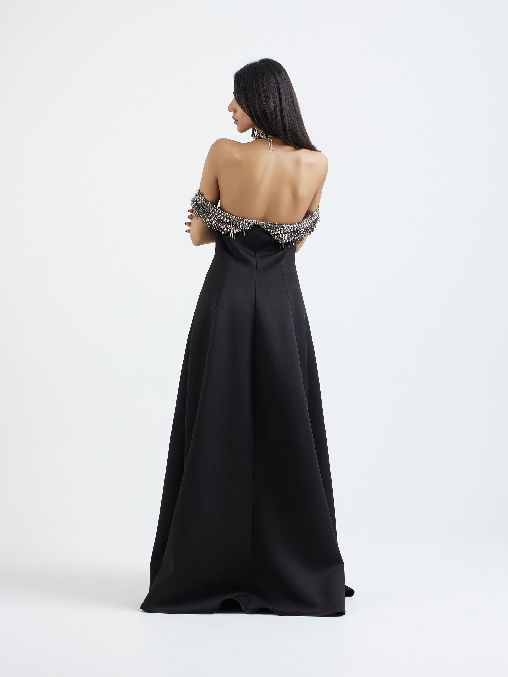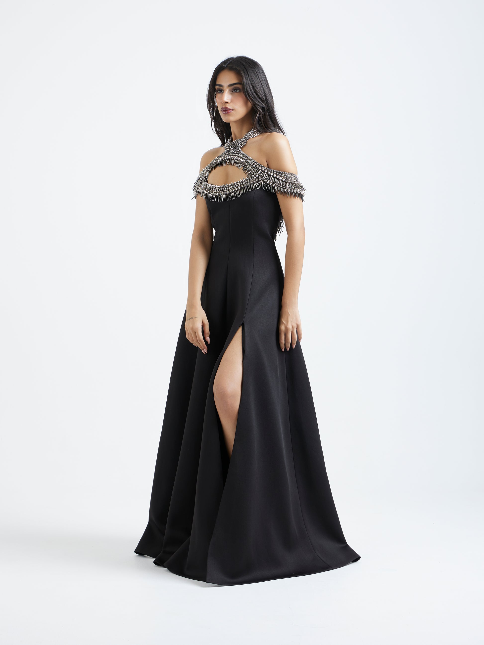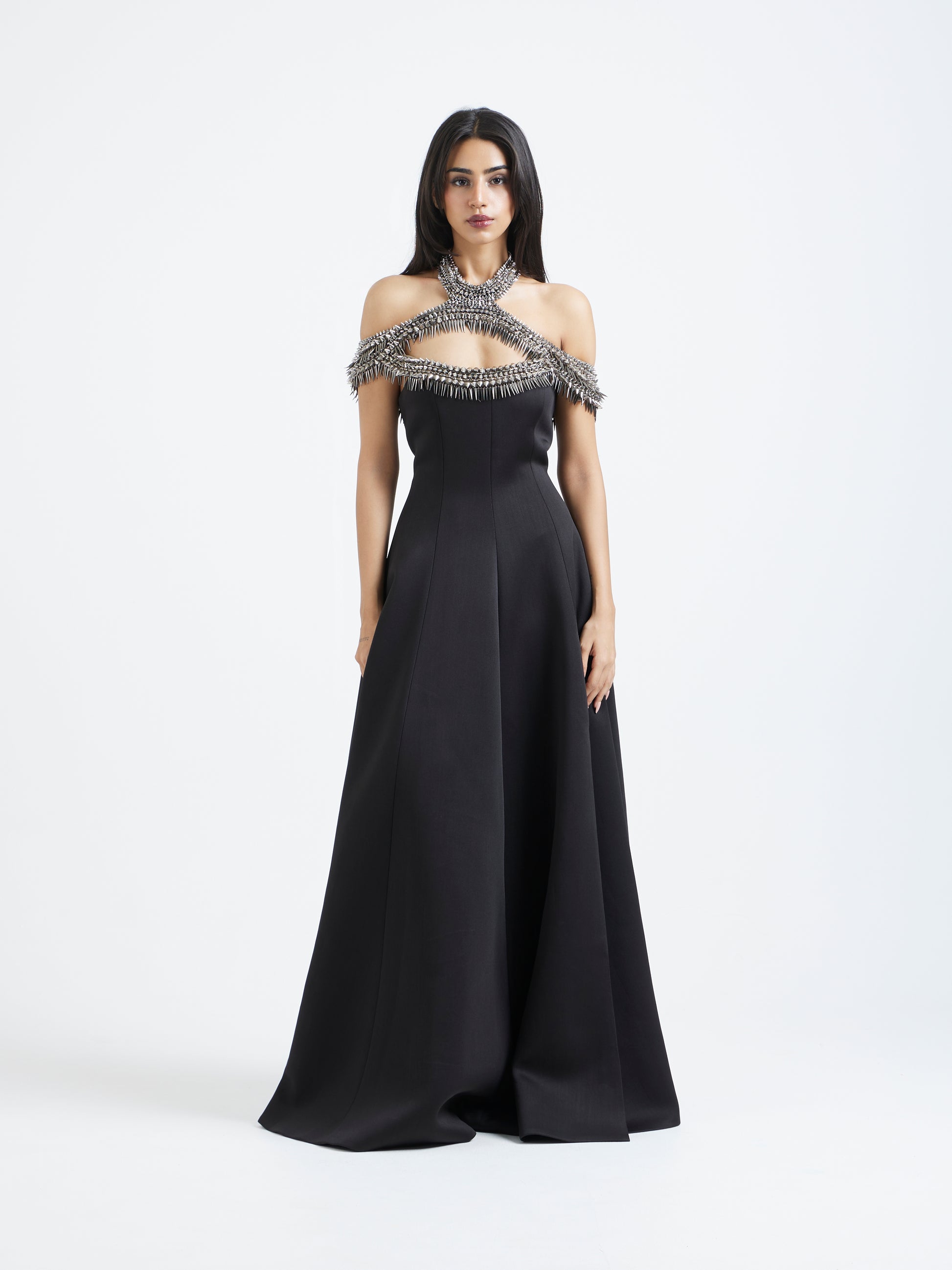 Crafted in premium neoprene, this sleek black gown is paired with a detachable statement overlay embroidered with intricate spikes and textured embellishments.