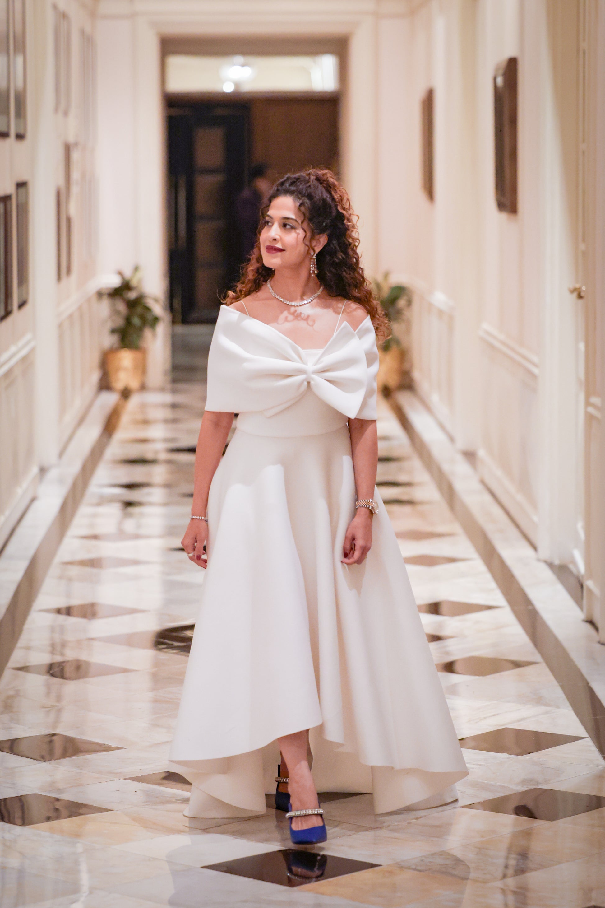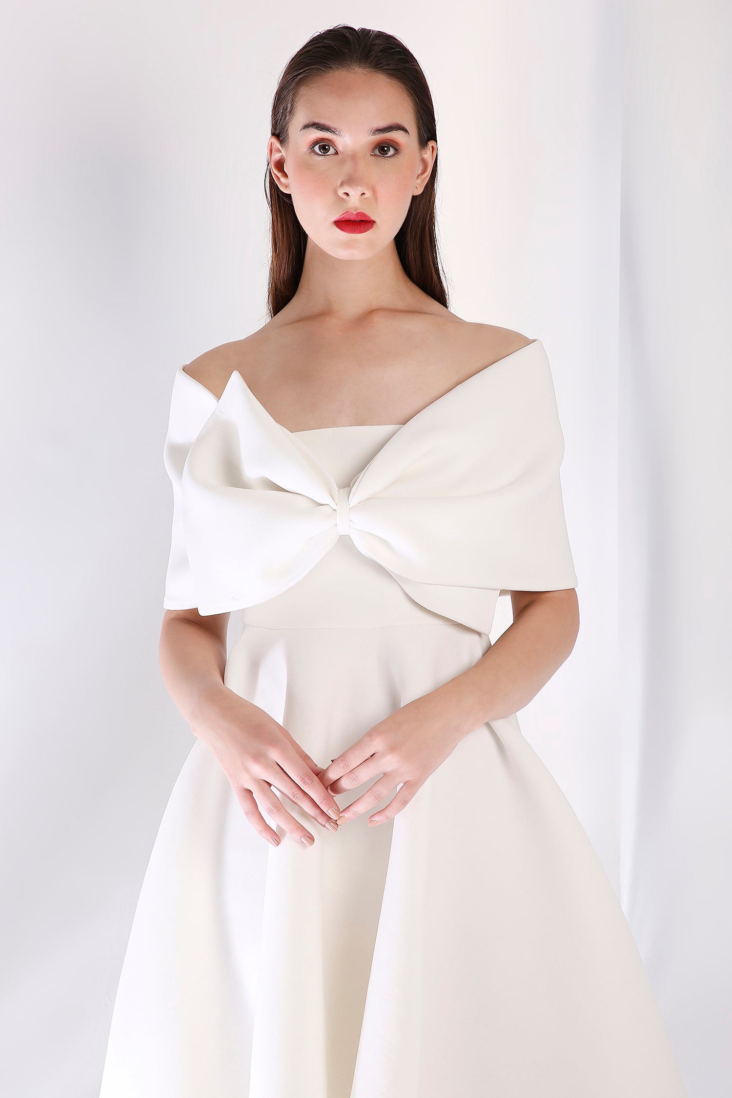 Paired with the Bow Wrap, a detachable off-shoulder add-on that brings drama and versatility. Style it over one shoulder or wear it off-the-shoulder — either way, it adds a bold, feminine touch to the overall look.