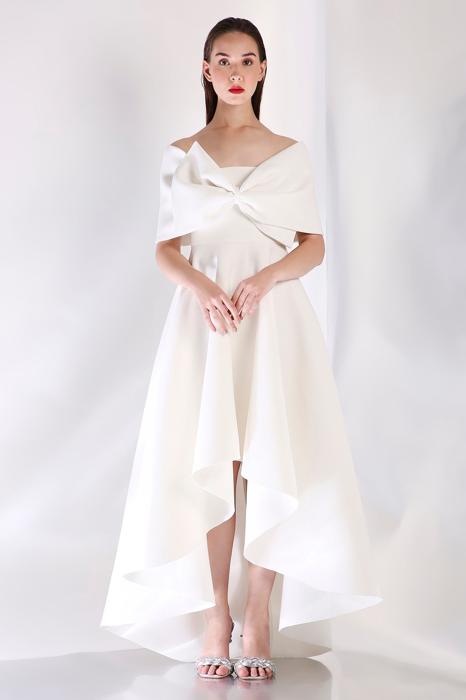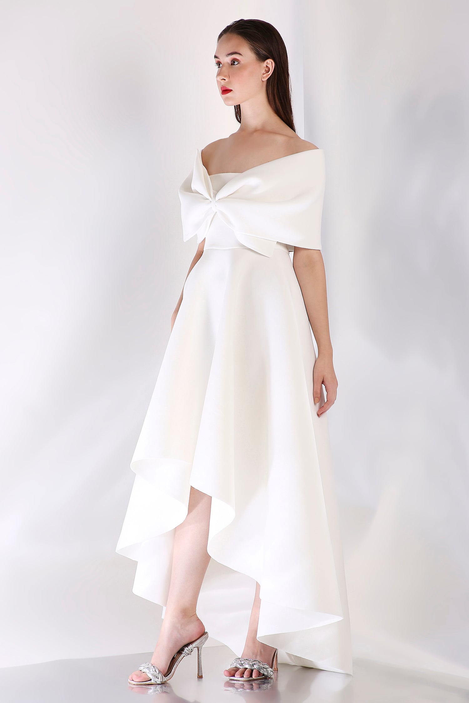 The Imperial Dress showcases our best-selling silhouette — a strapless design that fits snugly through the bust and flares out from the waist into a striking high-low hemline. Sculptural yet fluid, it moves gracefully and flatters a range of body types.