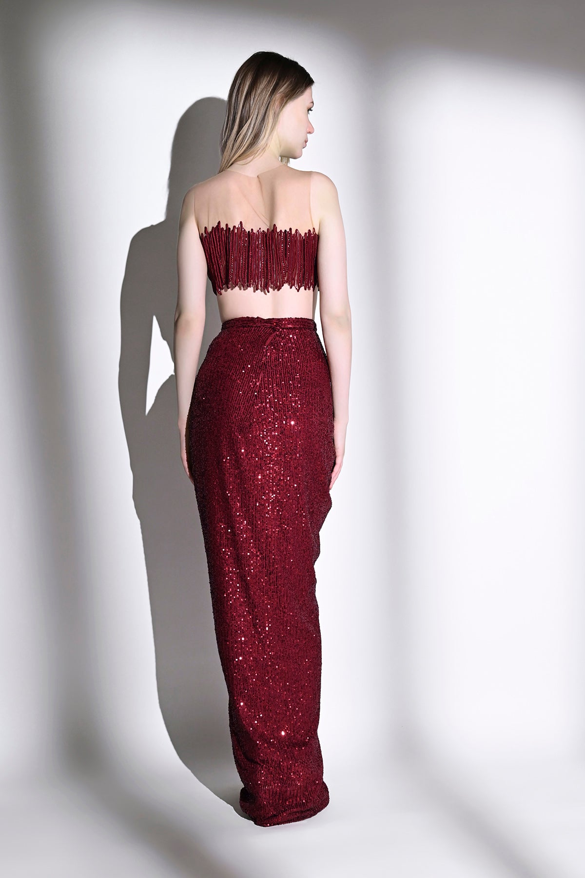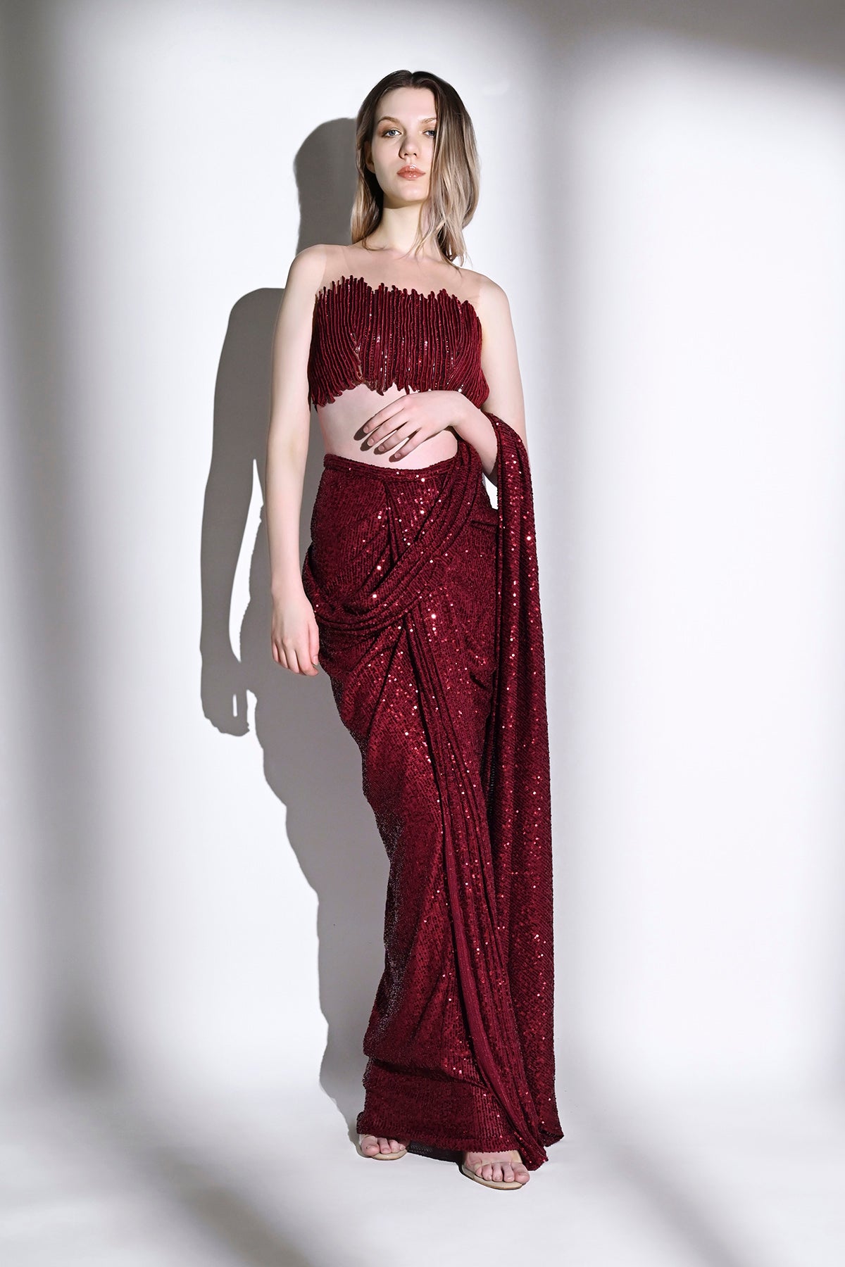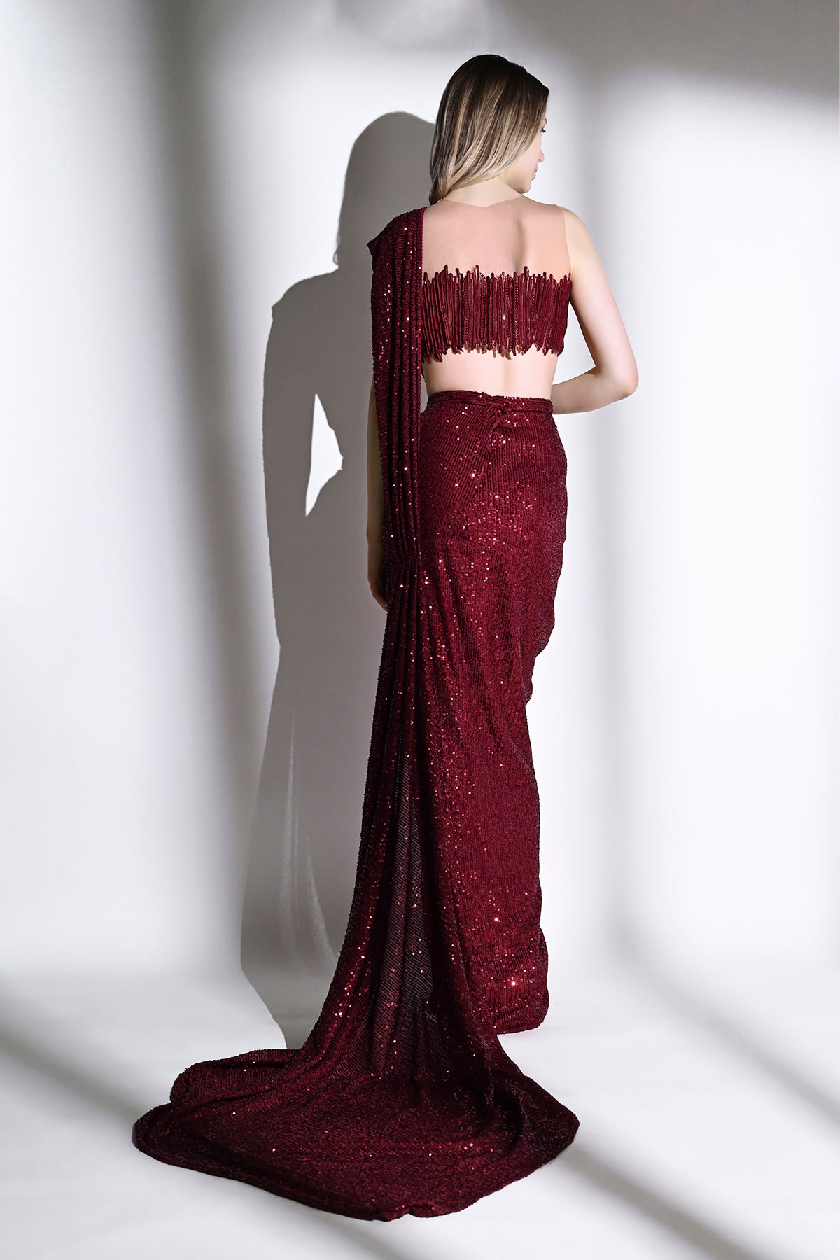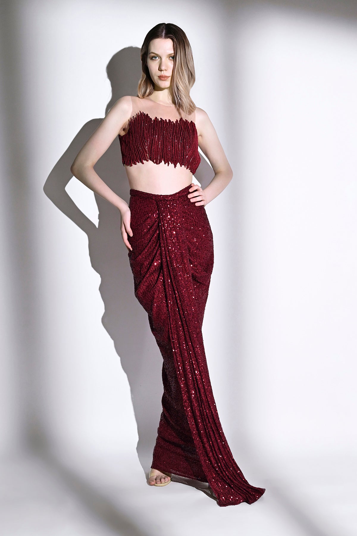 Featuring a crop and skirt set with a detachable saree drape. The hand embroidered blouse comes on a net base with asymmetric lines of beads, sequins and satin.