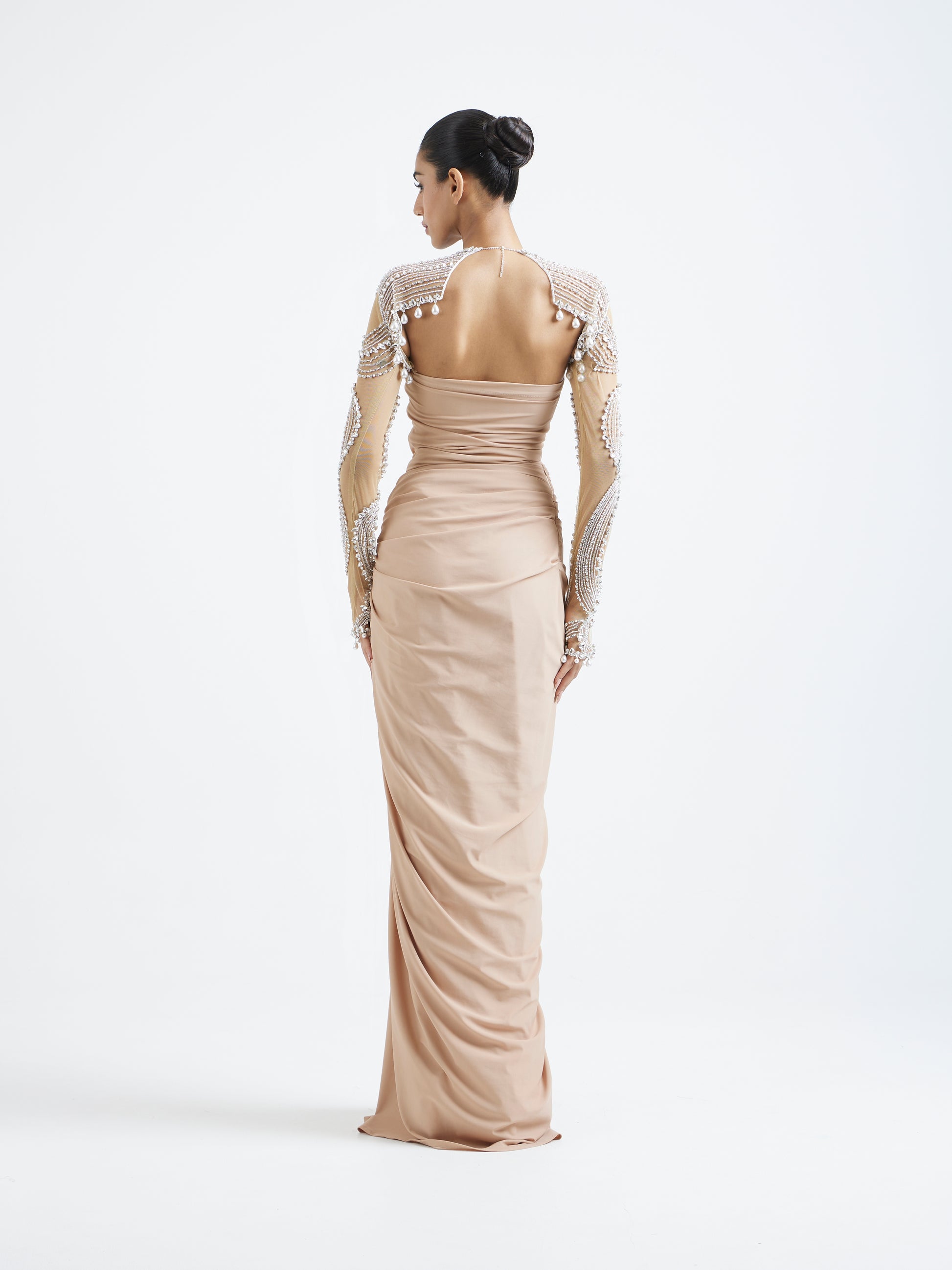 The detachable features sheer panels intricately adorned with pearls, stones, and cascading pearl hangings that frame the neckline and sleeves with couture precision.
