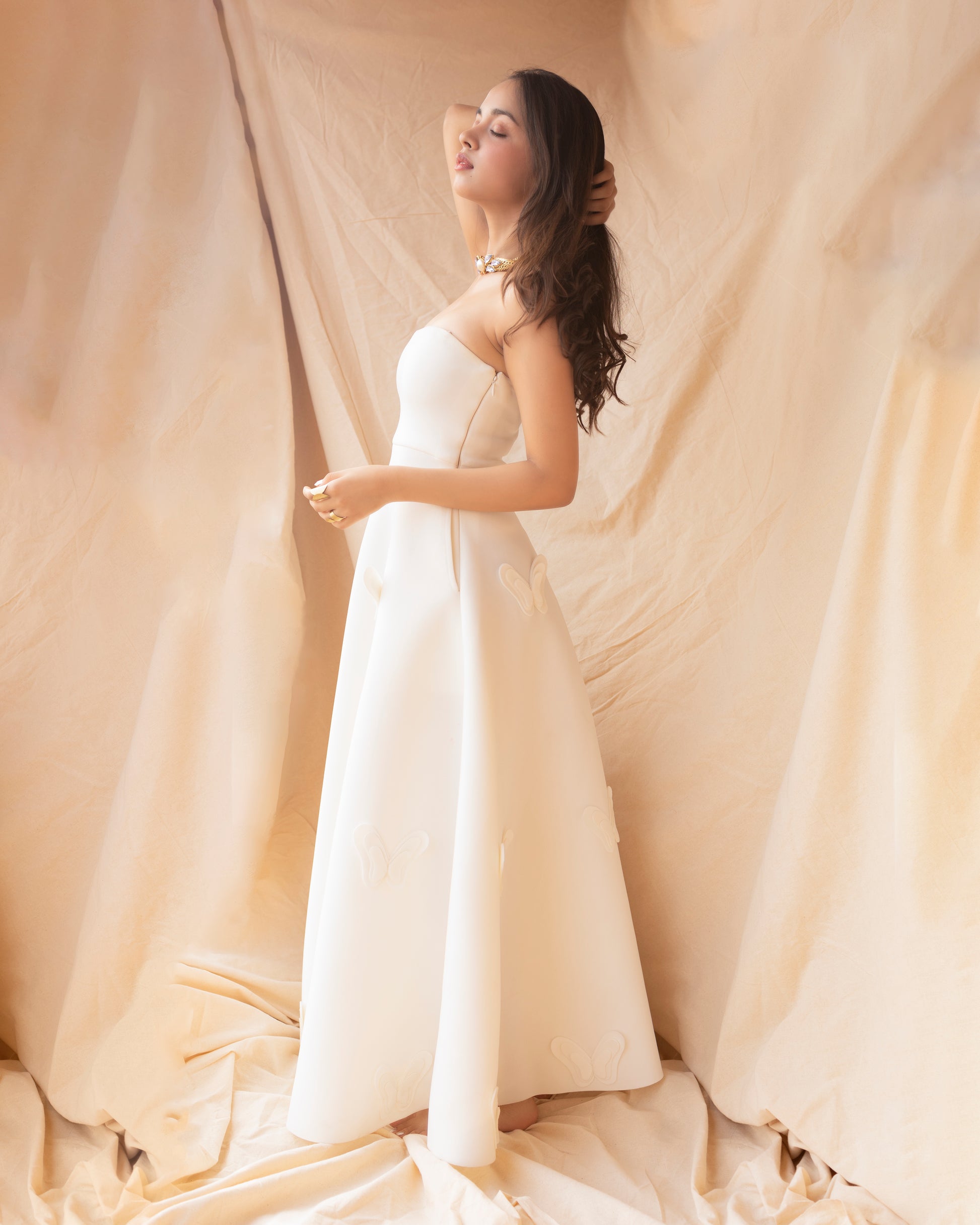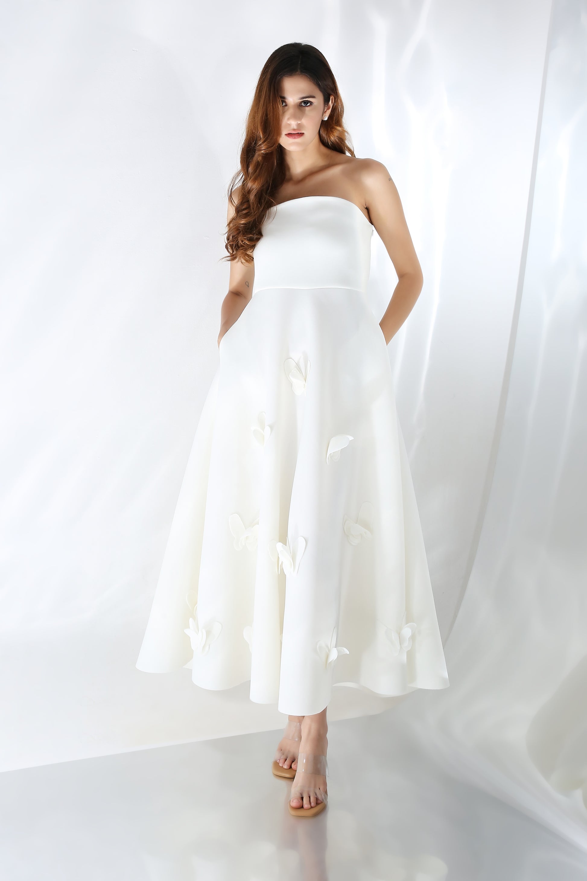 Amyra is a sculptural strapless dress crafted in smooth neoprene, designed to hold its shape while flattering yours. It features a structured flare that falls away from the body with elegance — and yes, it comes with pockets.