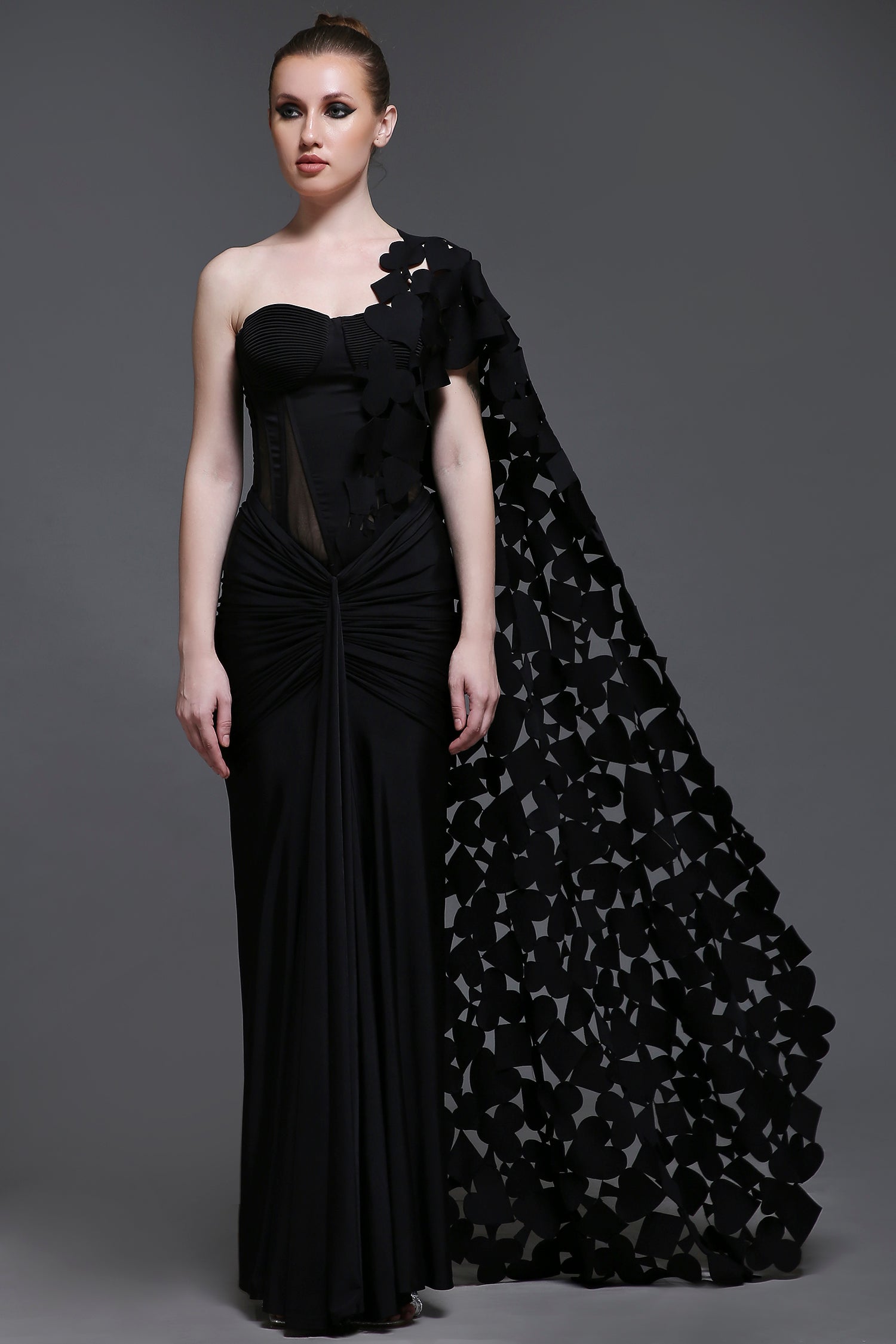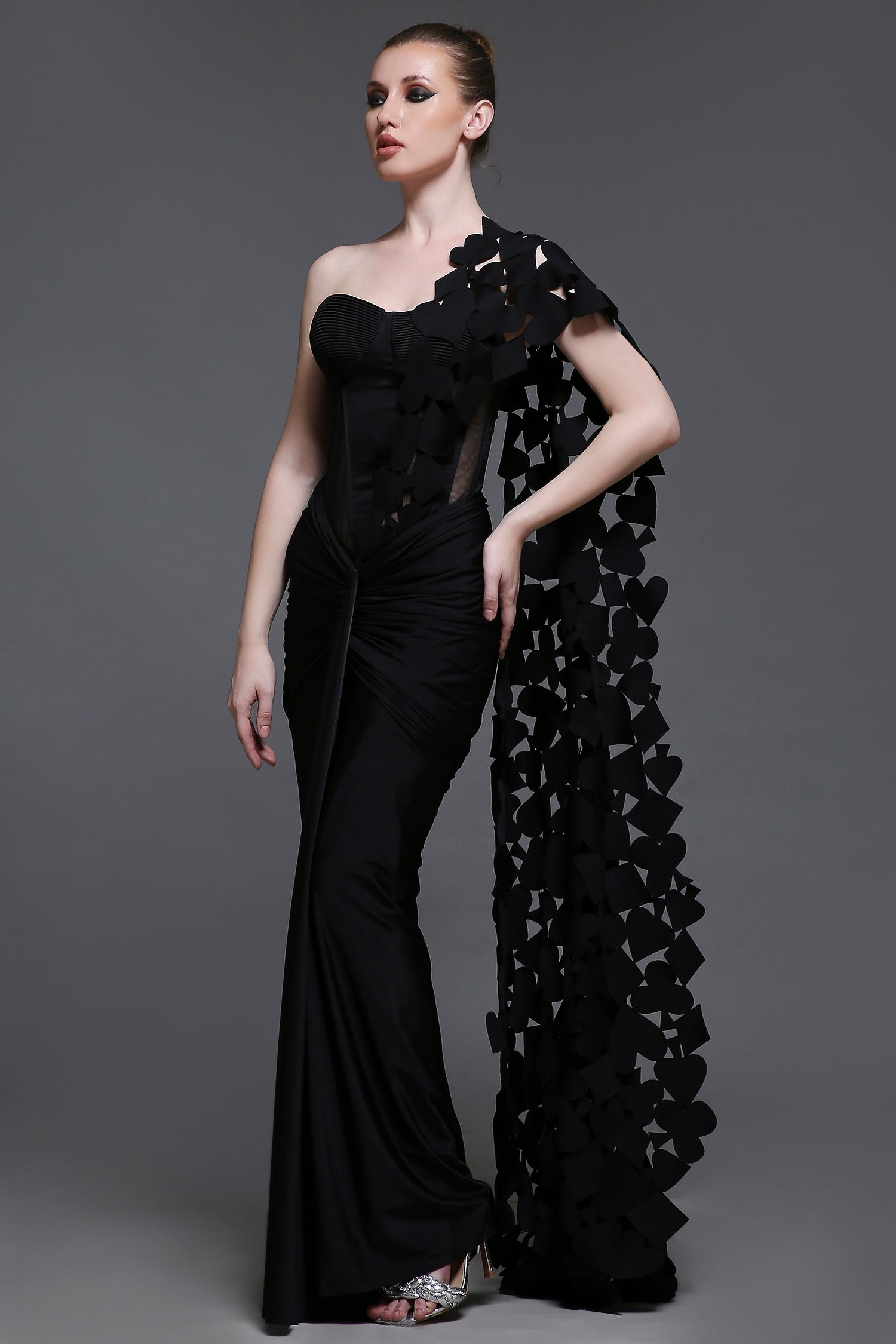 Completing the ensemble is a detachable drape with intricate cutwork patch detailing, adding a layer of elegance and artistry. Perfect for making a statement at any special occasion.