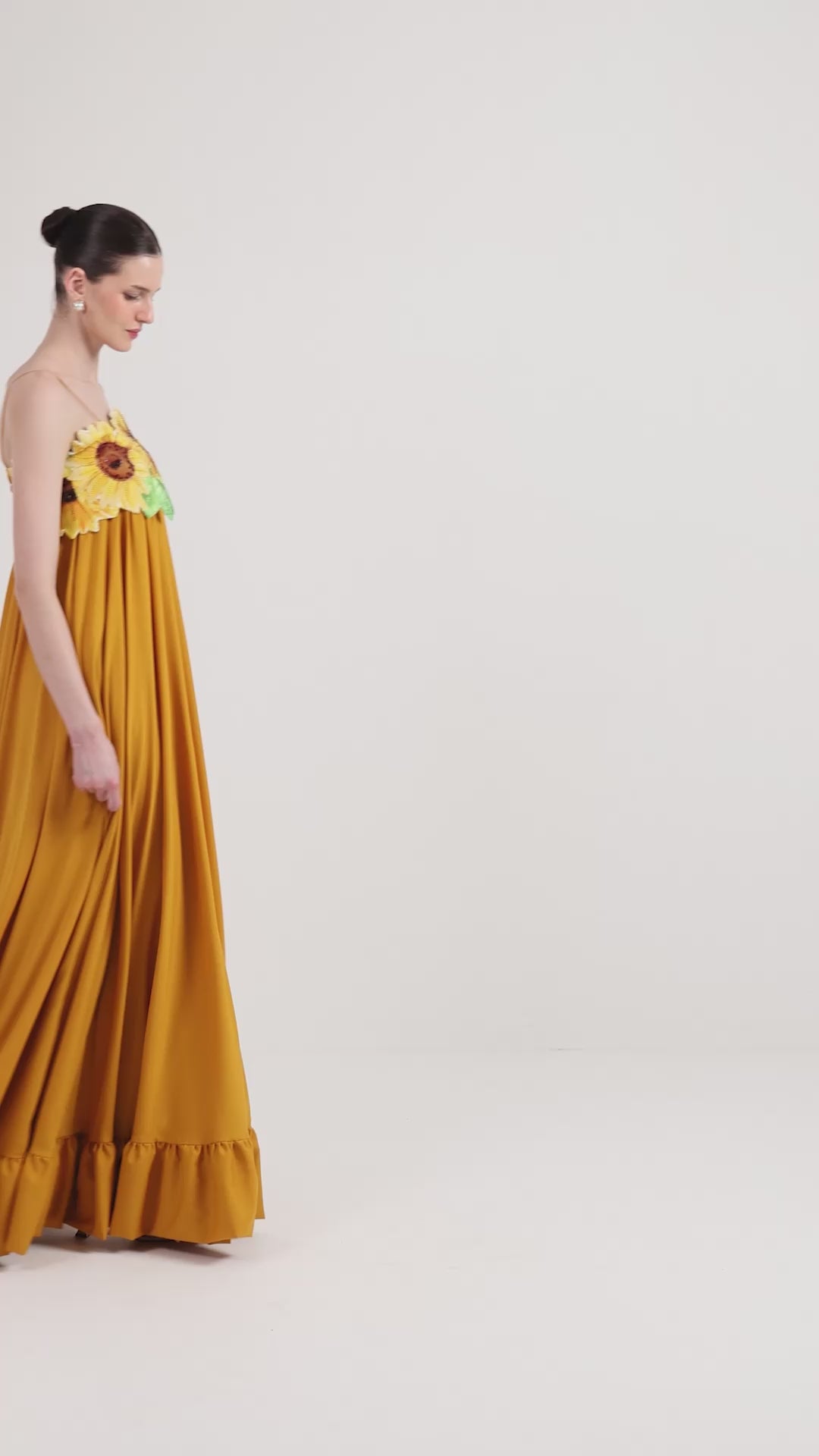 The silhouette features a detachable sunflower wrap, crafted with delicate shading and hand embellishments that bring each bloom to life. Light, feminine, and joyfully expressive, this piece blends artistry with ease, offering a look that’s both statement-making and impossibly comfortable.