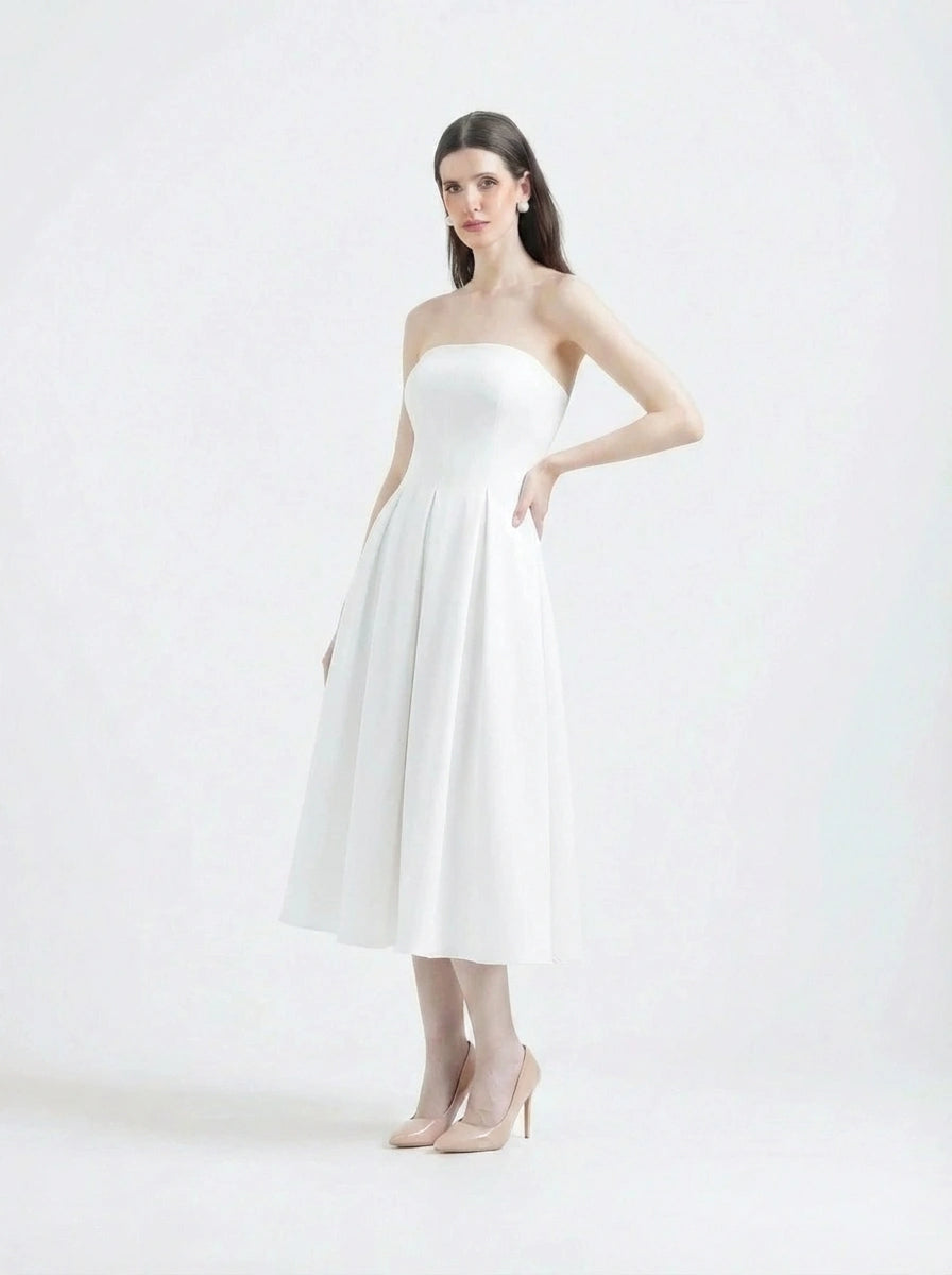 Its classic fit-and-flare silhouette is defined by a strapless bodice and a voluminous skirt, tailored to cinch at the natural waist. This versatile garment is designed to be instantly personalised using our Detachable Overlays, transitioning the sophisticated black look seamlessly across seasons and occasions.