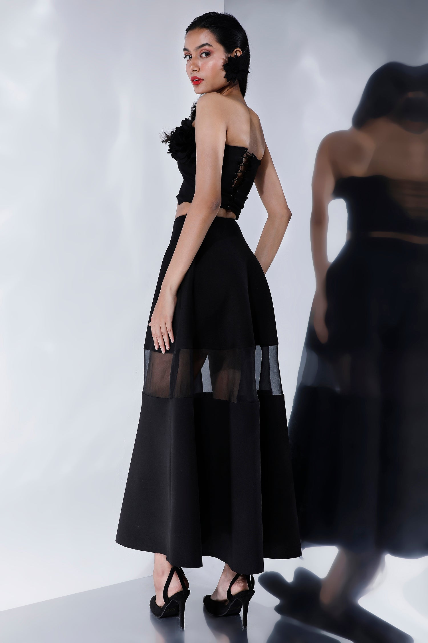 The fit and flare skirt flows away from the body, giving it a structured fall due to the nature of the fabric. The sheer organza inset gives an alluring effect.