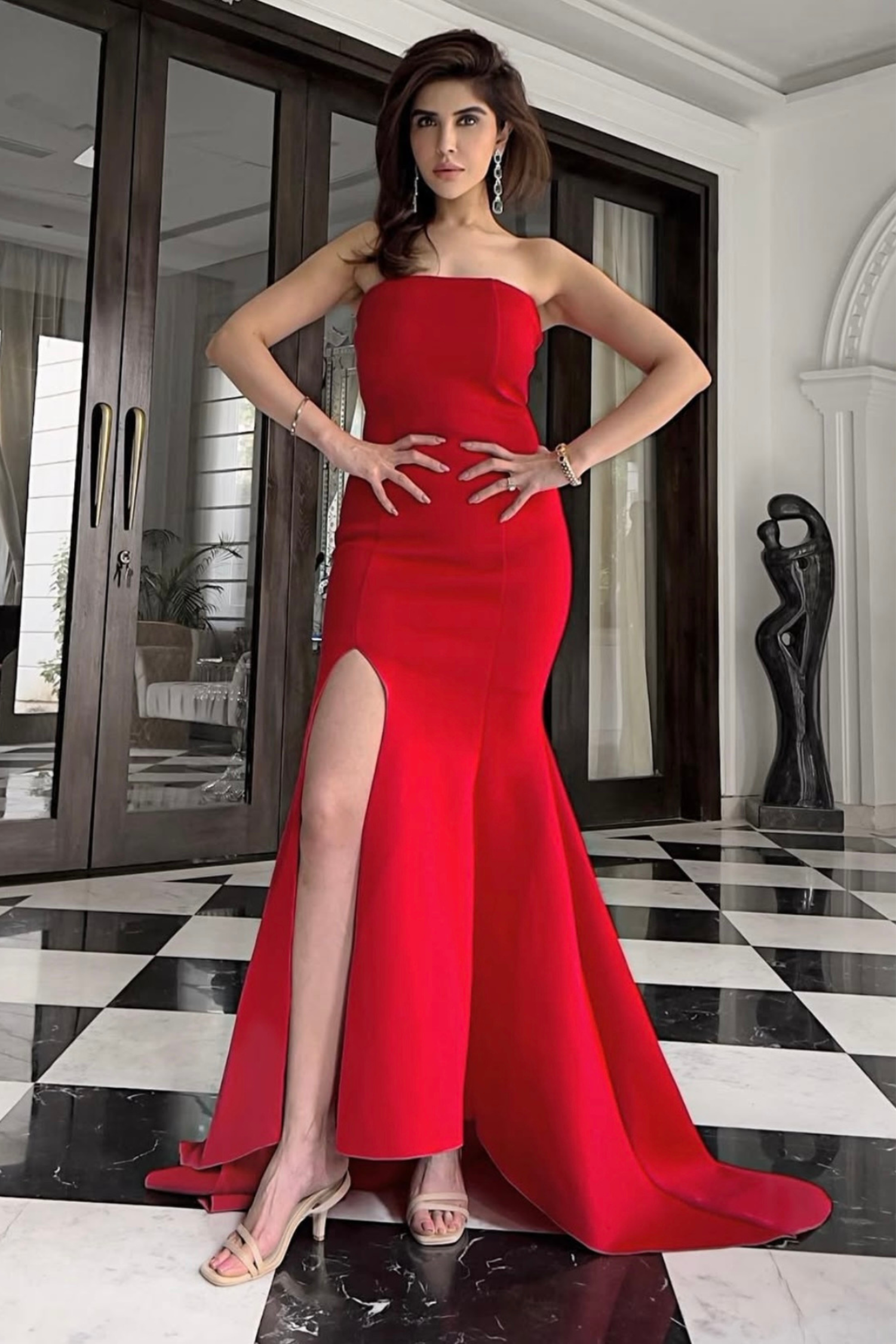 Featuring Rohini in a strapless gown with a straight neckline and a structured trailing flare.