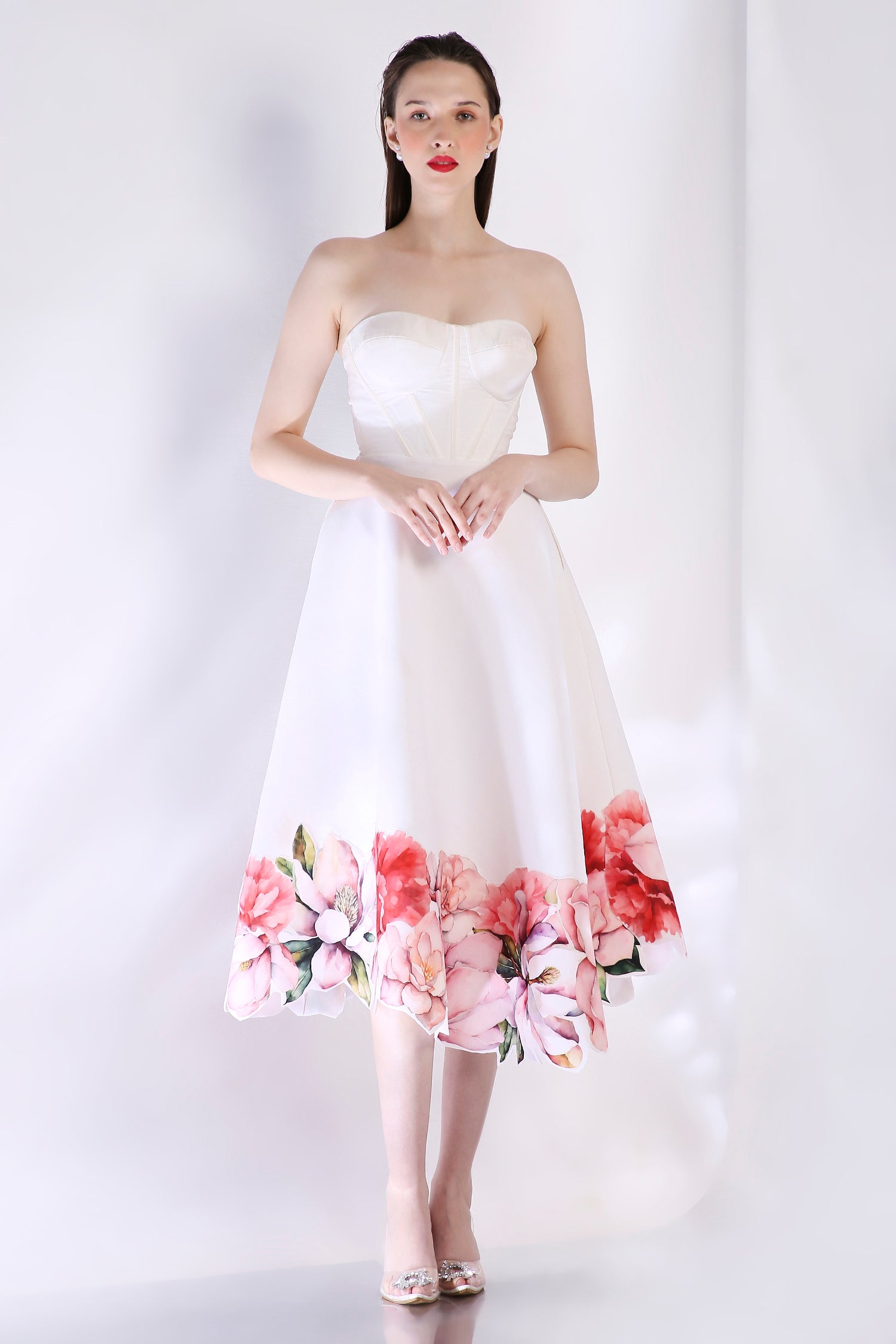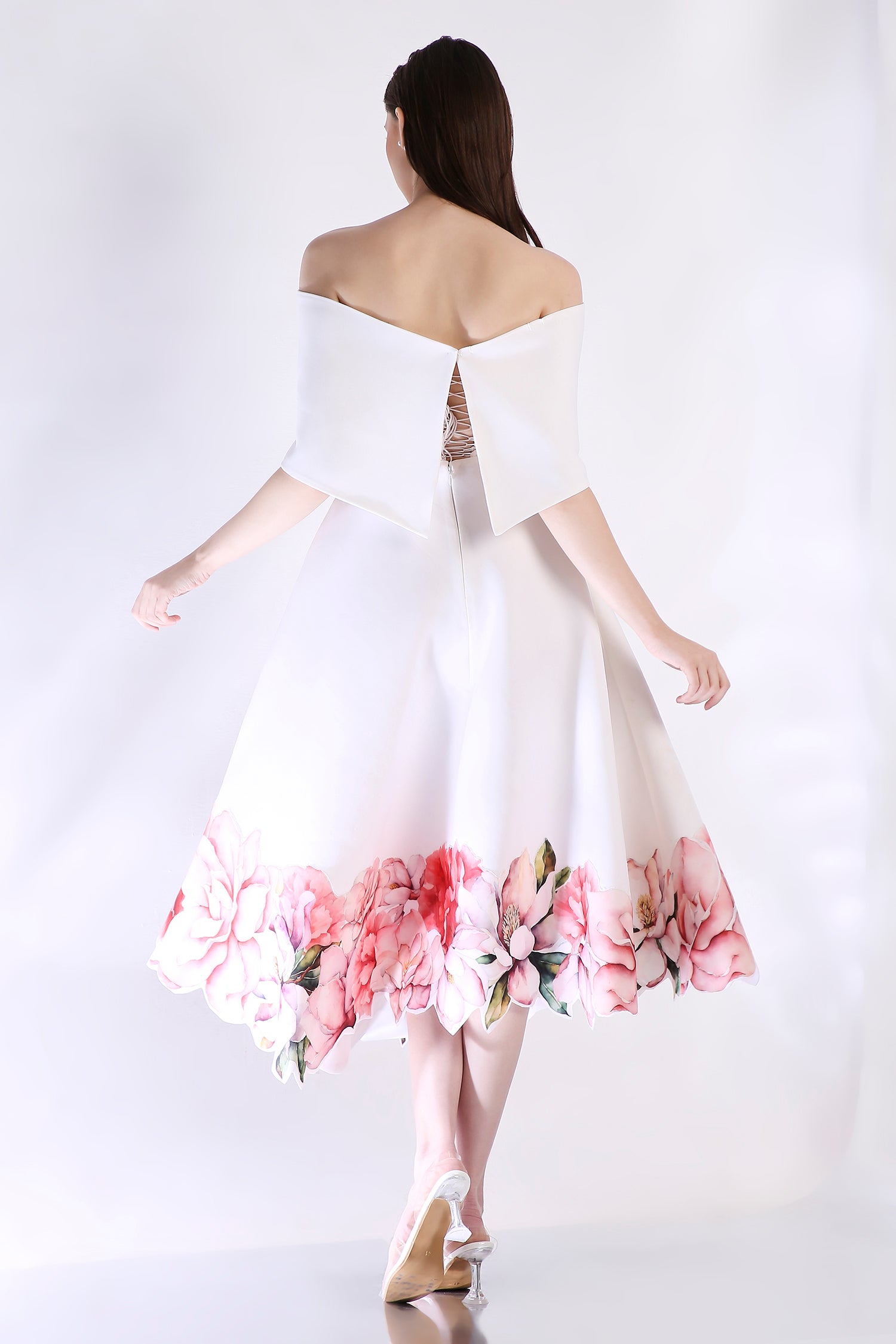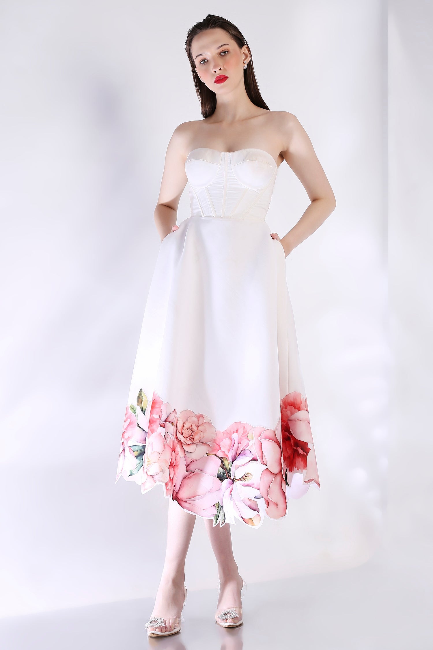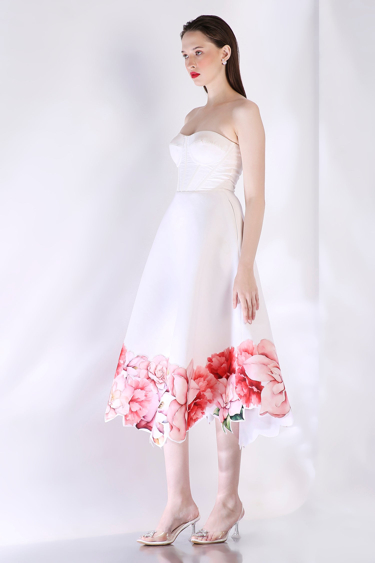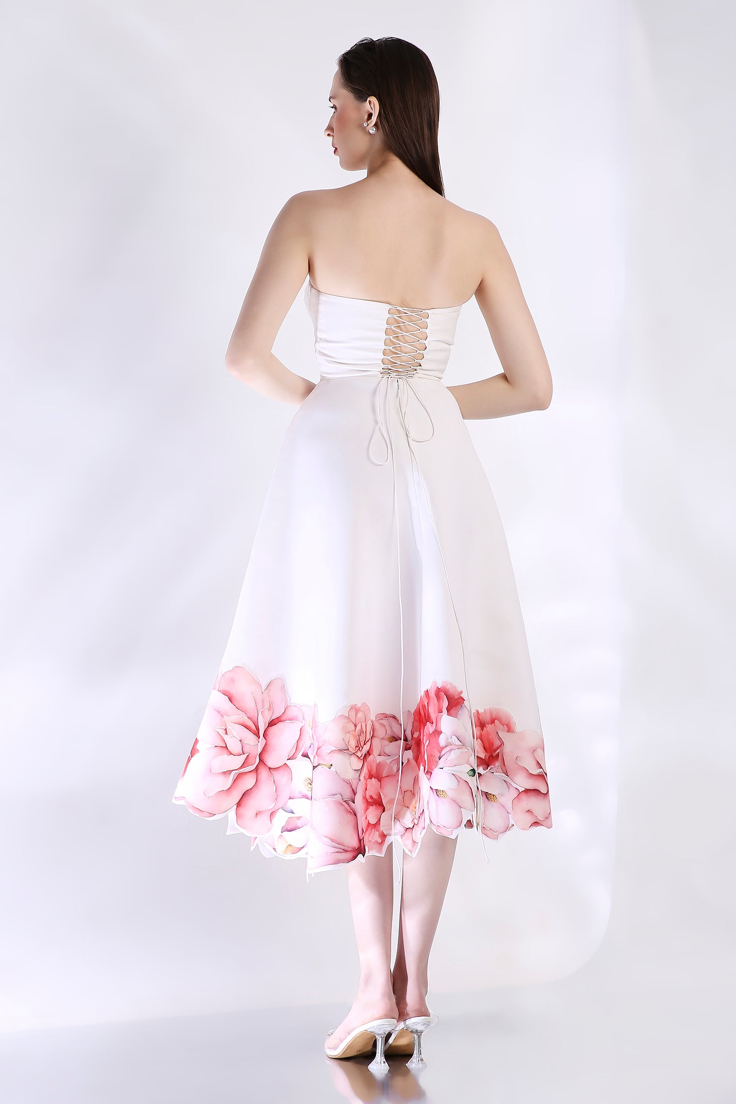The Rose dress embodies elegance with its abstract floral design, emphasised with cutwork around the hem. The dress features a corseted bodice and a flared bottom.