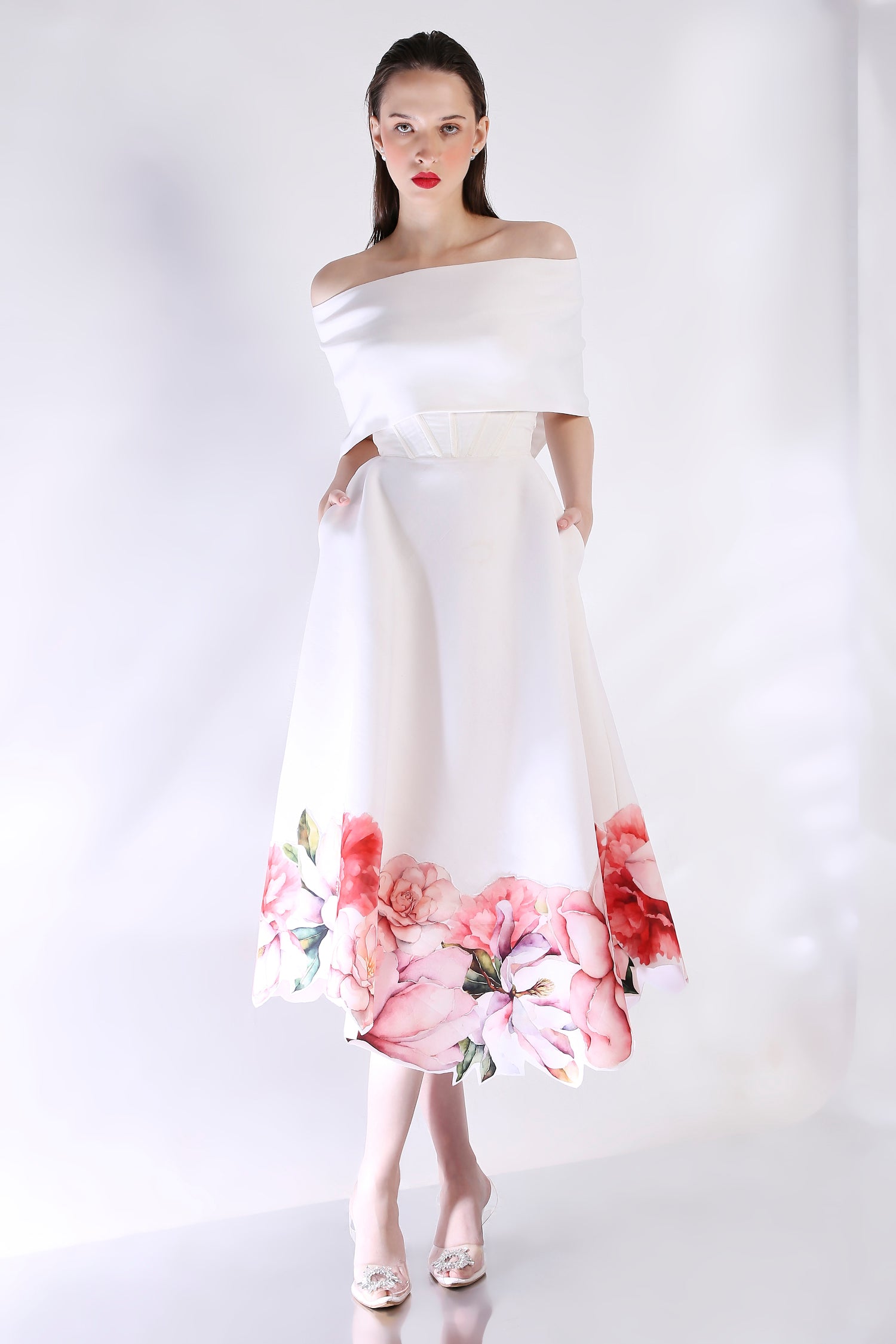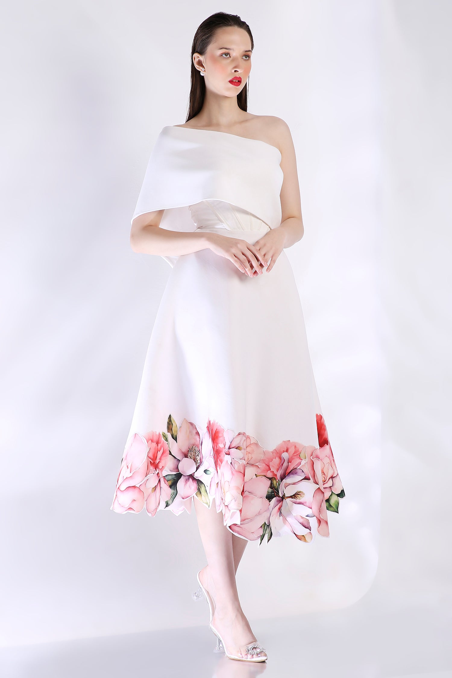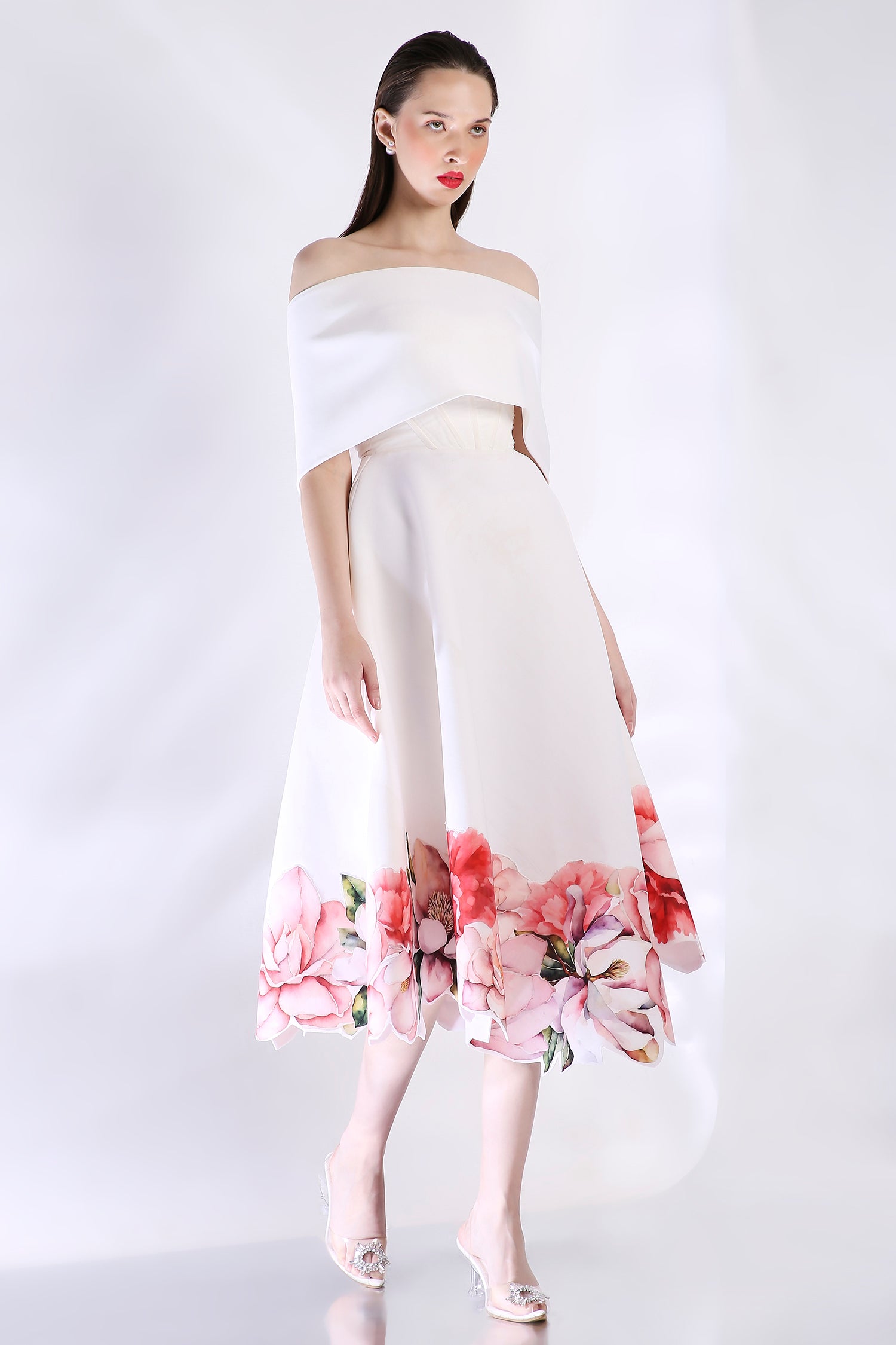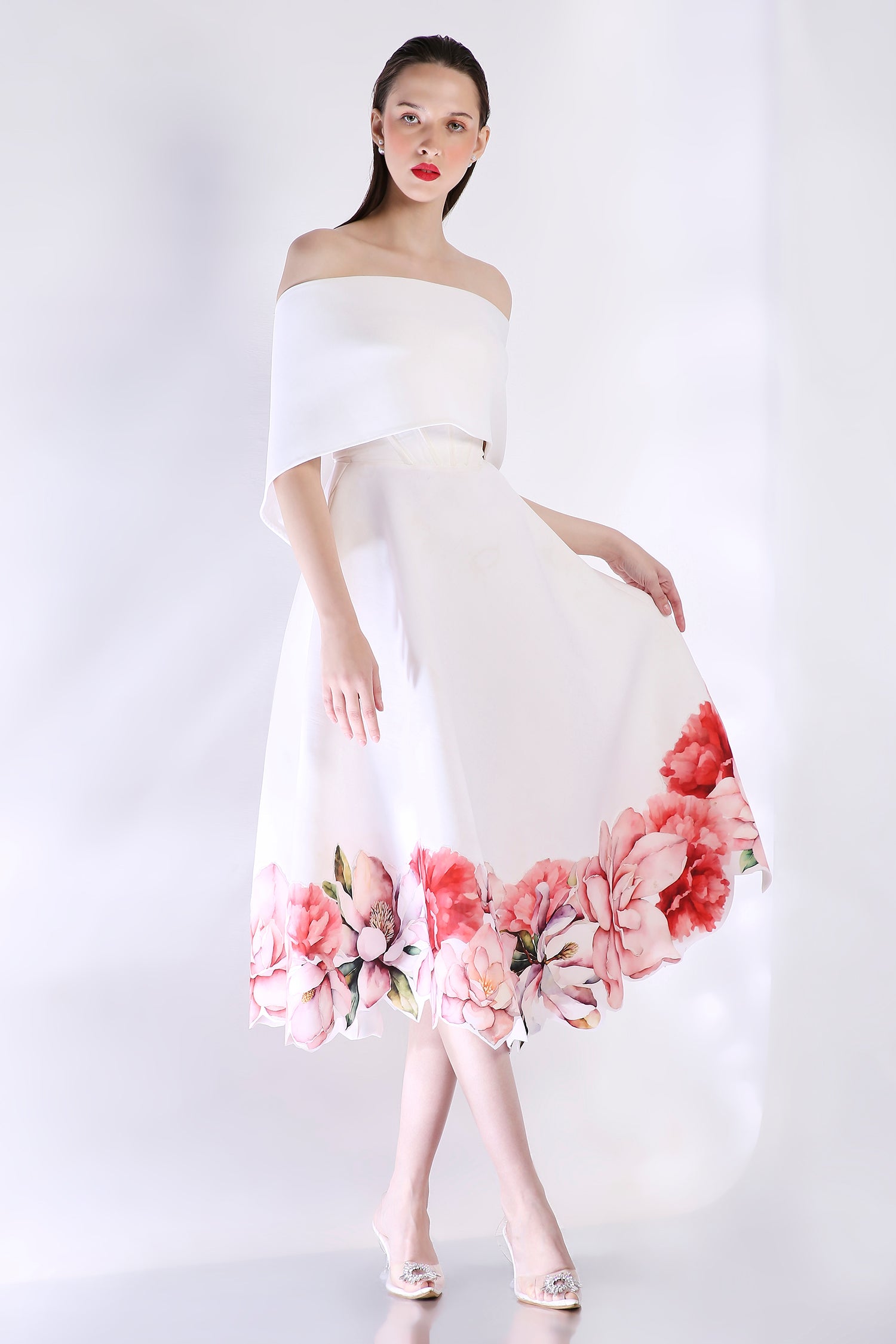 The Rose dress embodies elegance with its abstract floral design, emphasised with cutwork around the hem. The dress features a corseted bodice and a flared bottom.