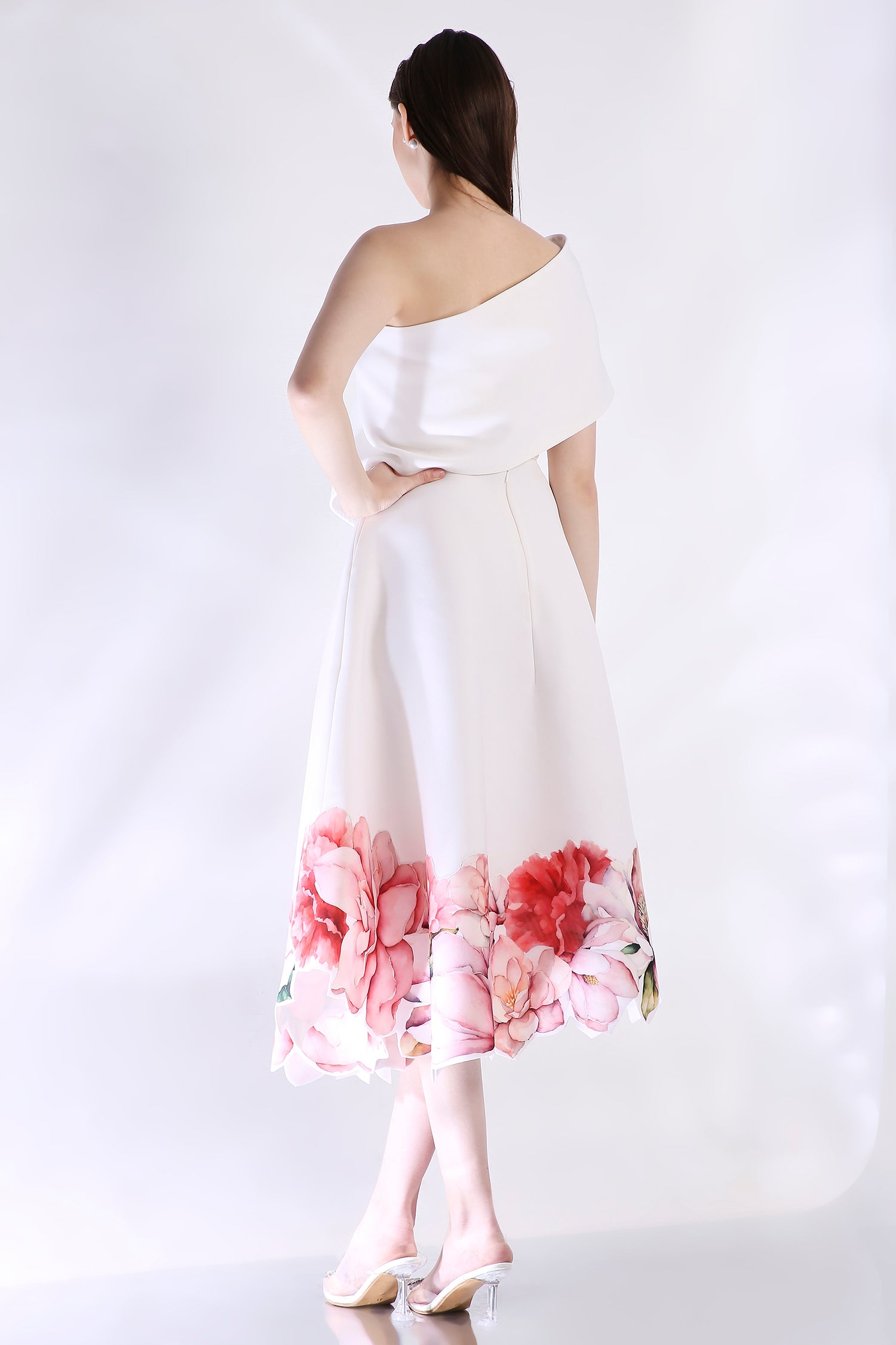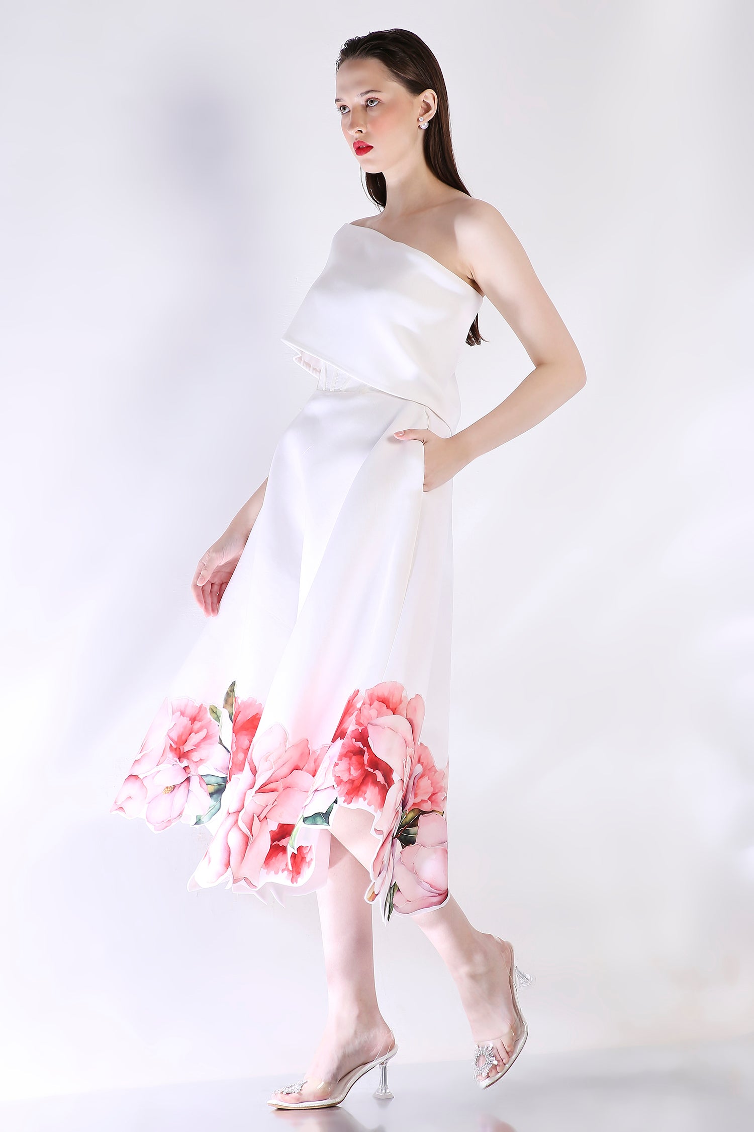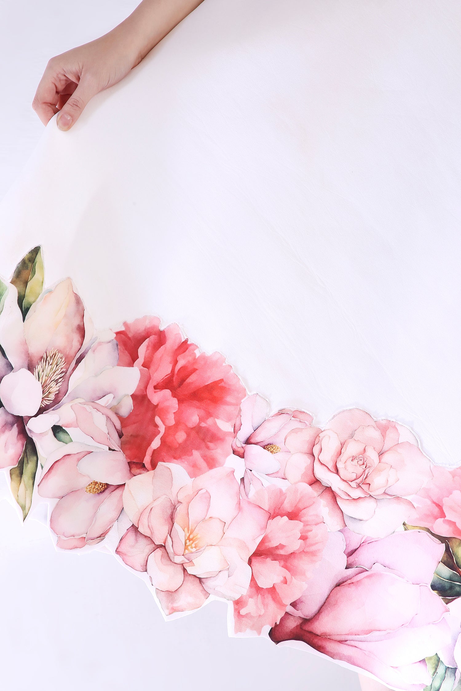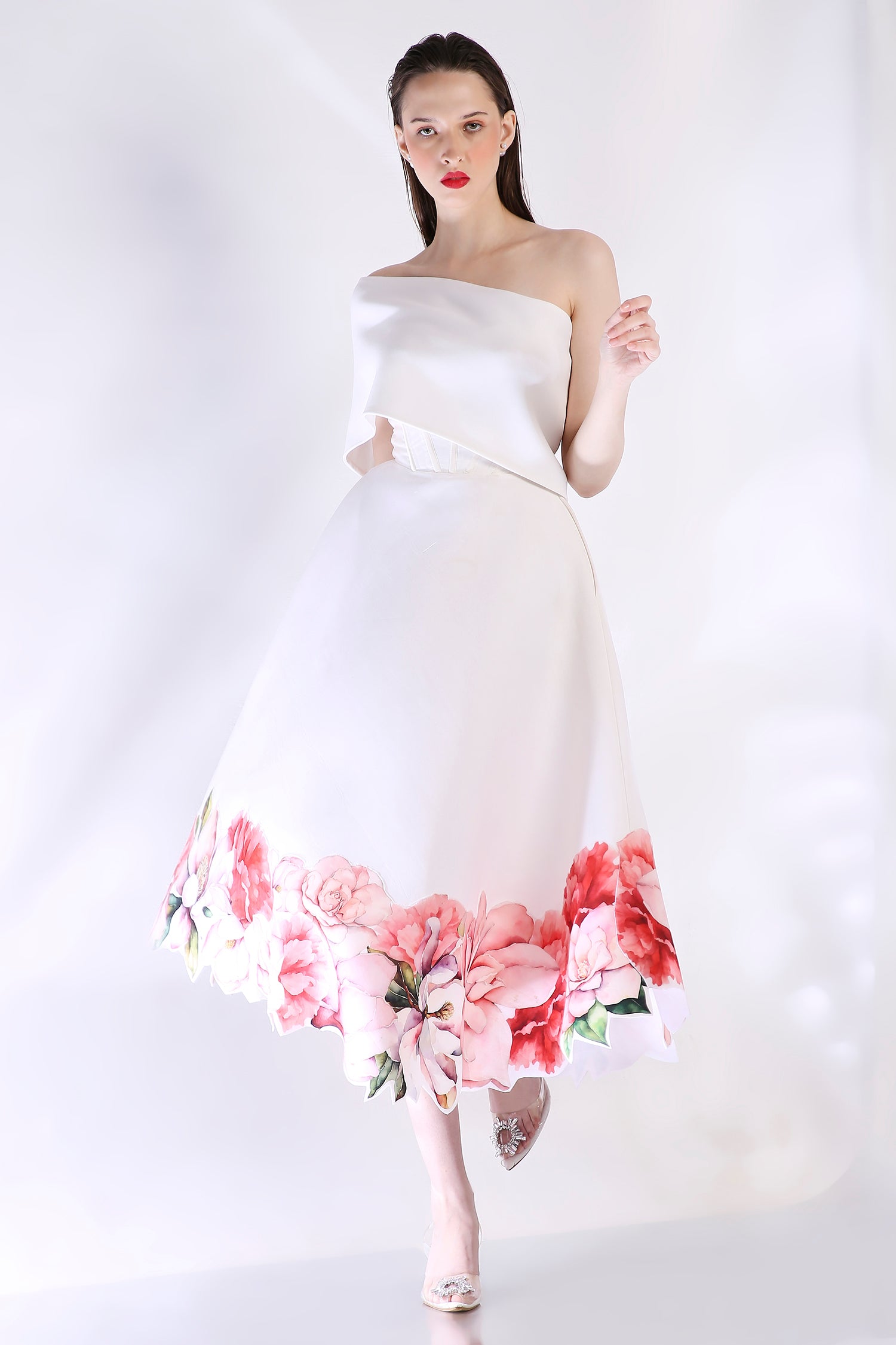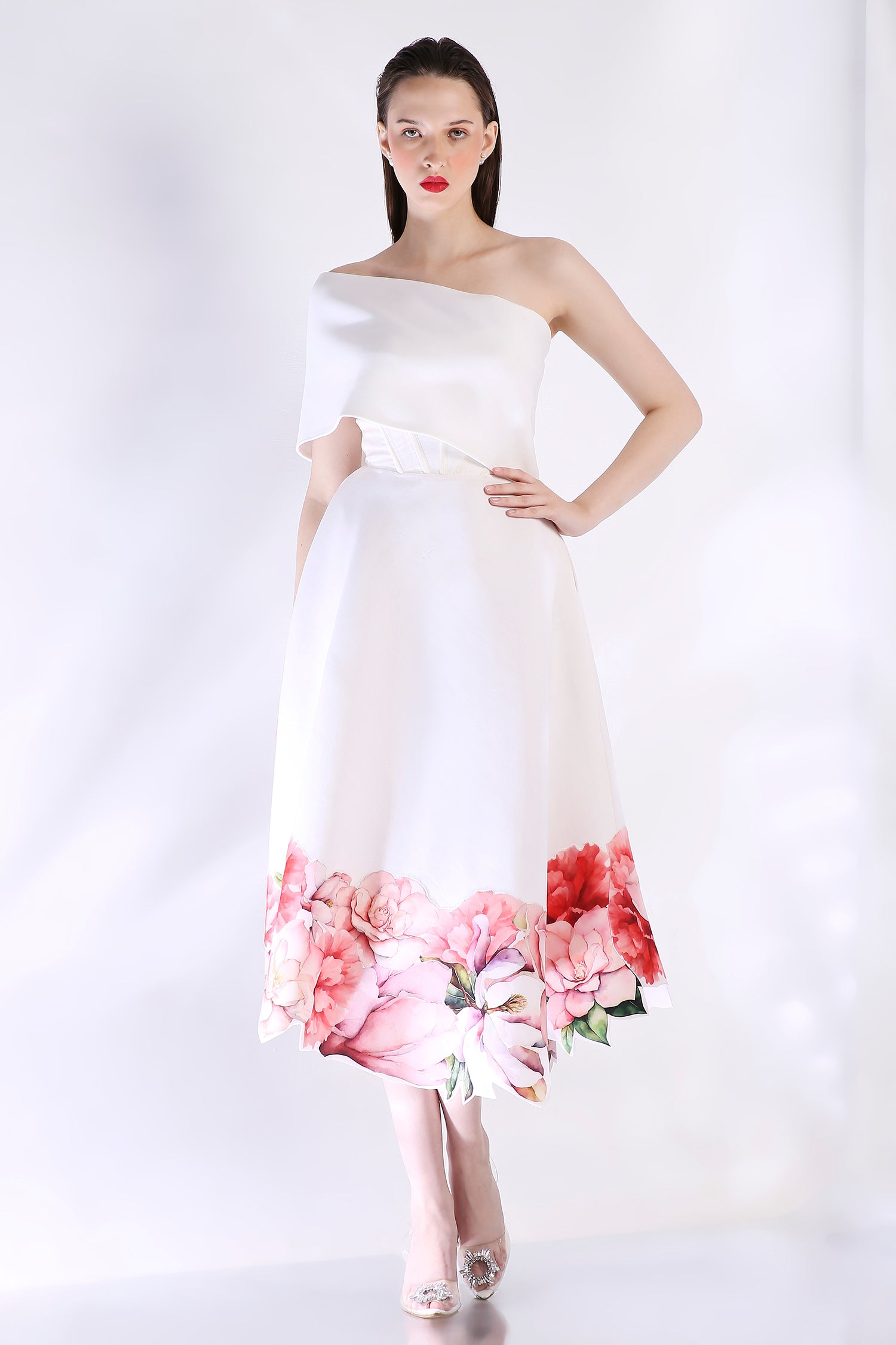 The Rose dress embodies elegance with its abstract floral design, emphasised with cutwork around the hem. The dress features a corseted bodice and a flared bottom.