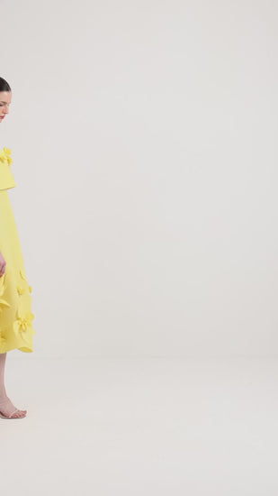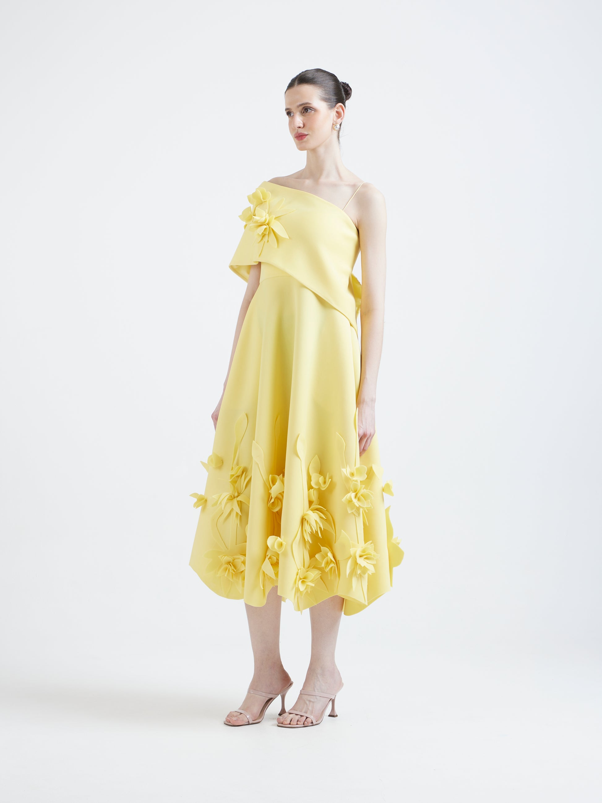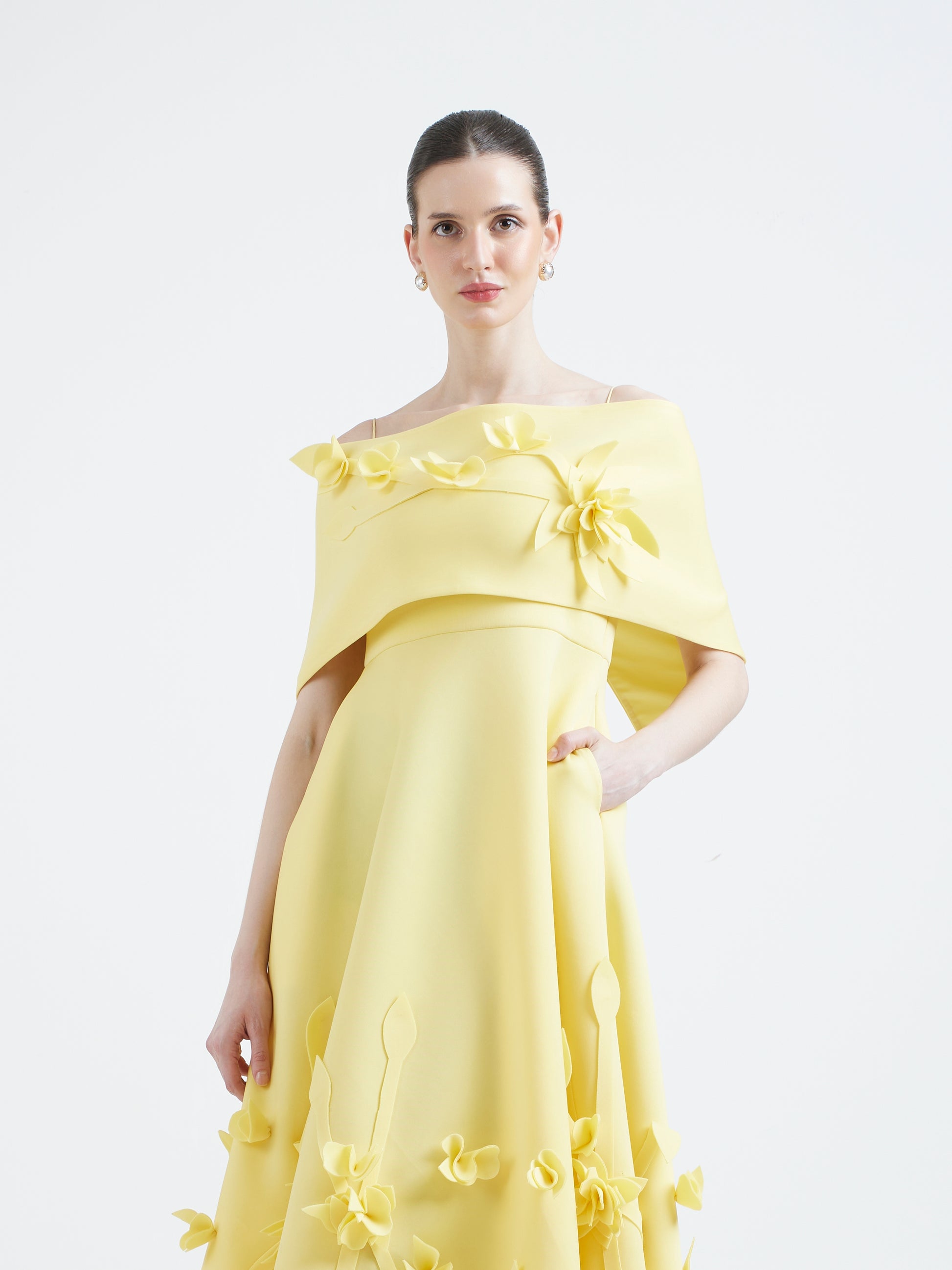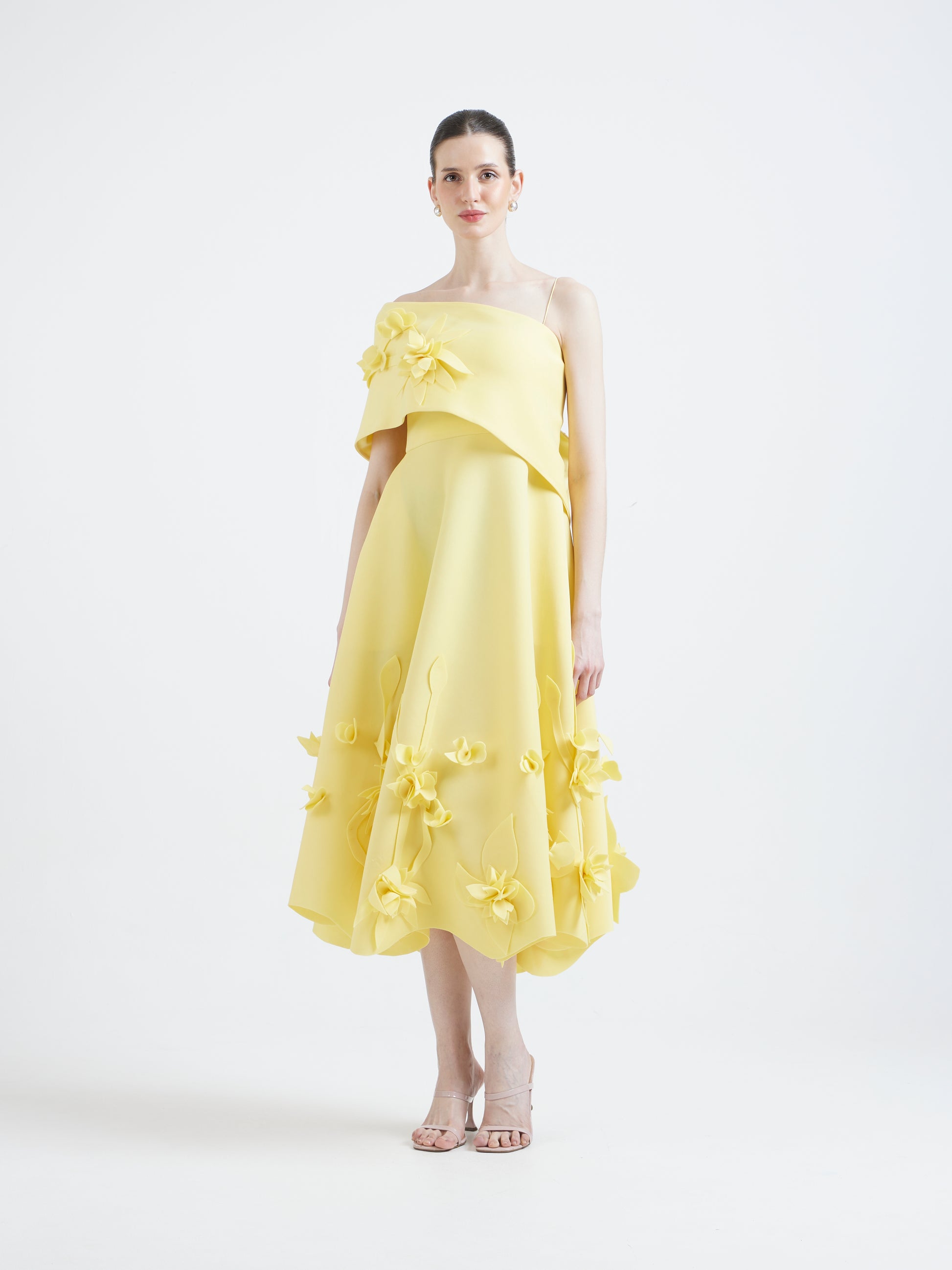 Radiating soft elegance, this sunshine-yellow dress is crafted in luxurious neoprene fabric that holds its shape beautifully while offering a smooth, sculpted fall.