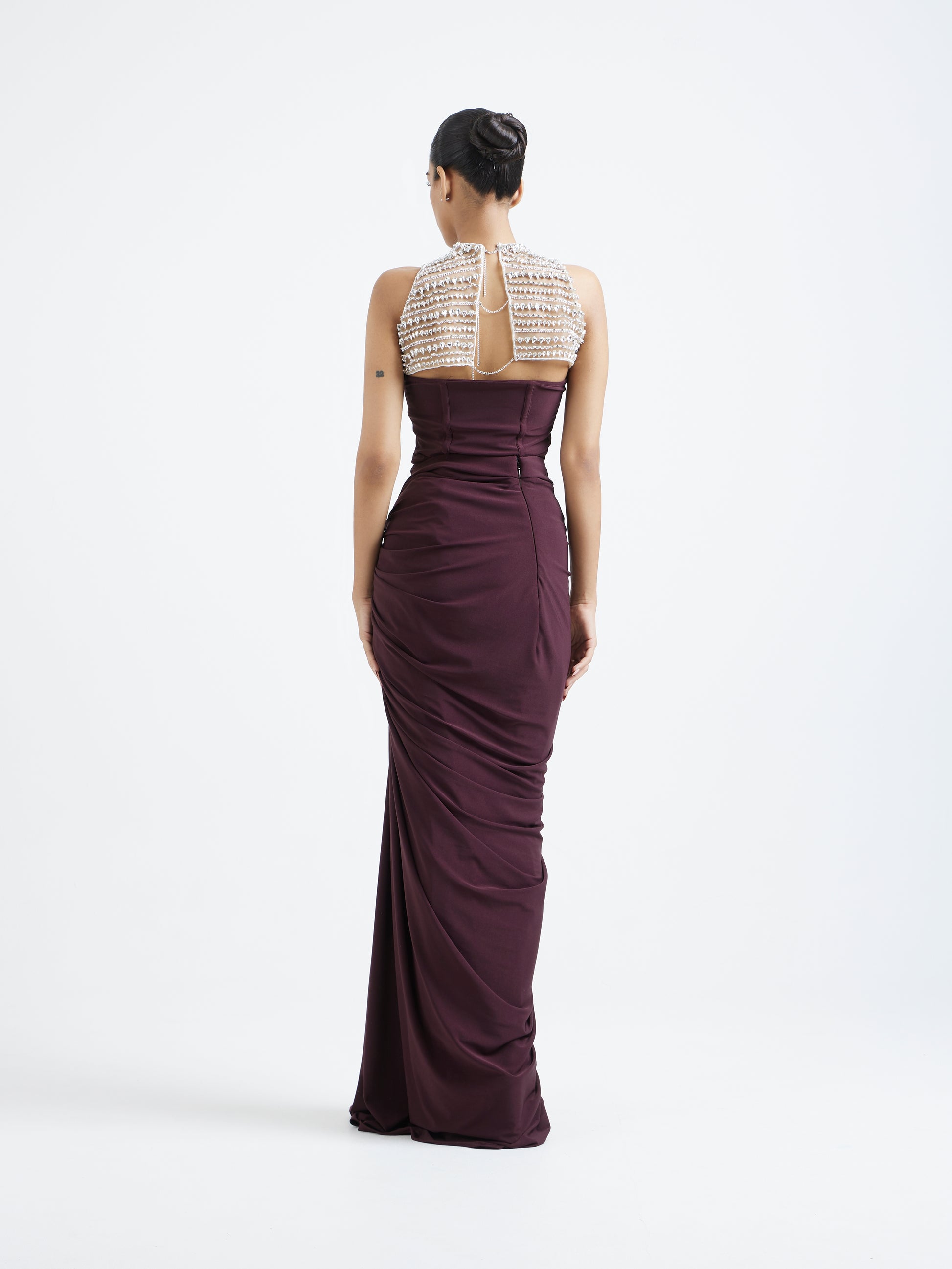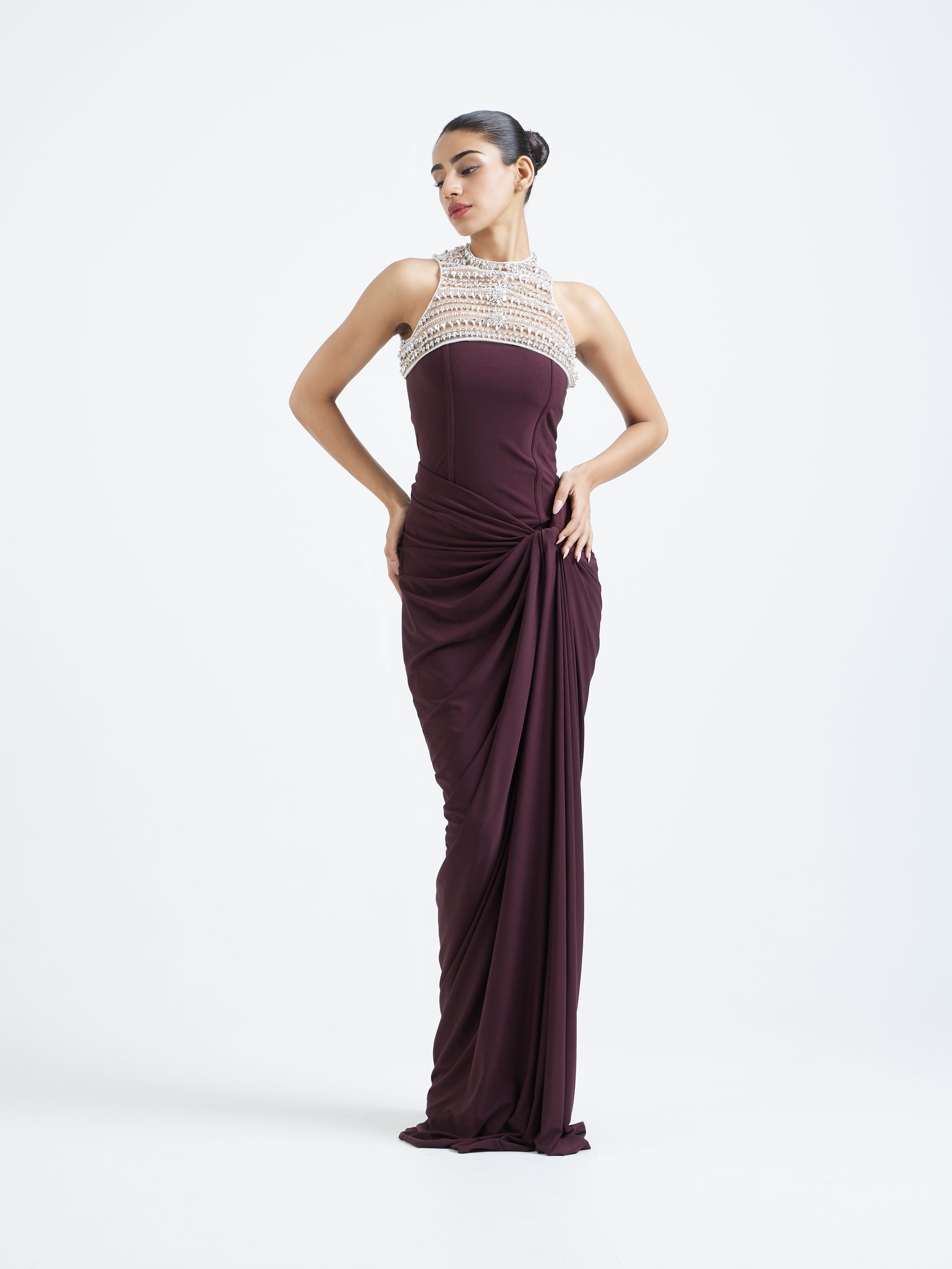 The silhouette features a meticulously ruched drape that gathers at the waist, creating an elongated, statuesque fall.