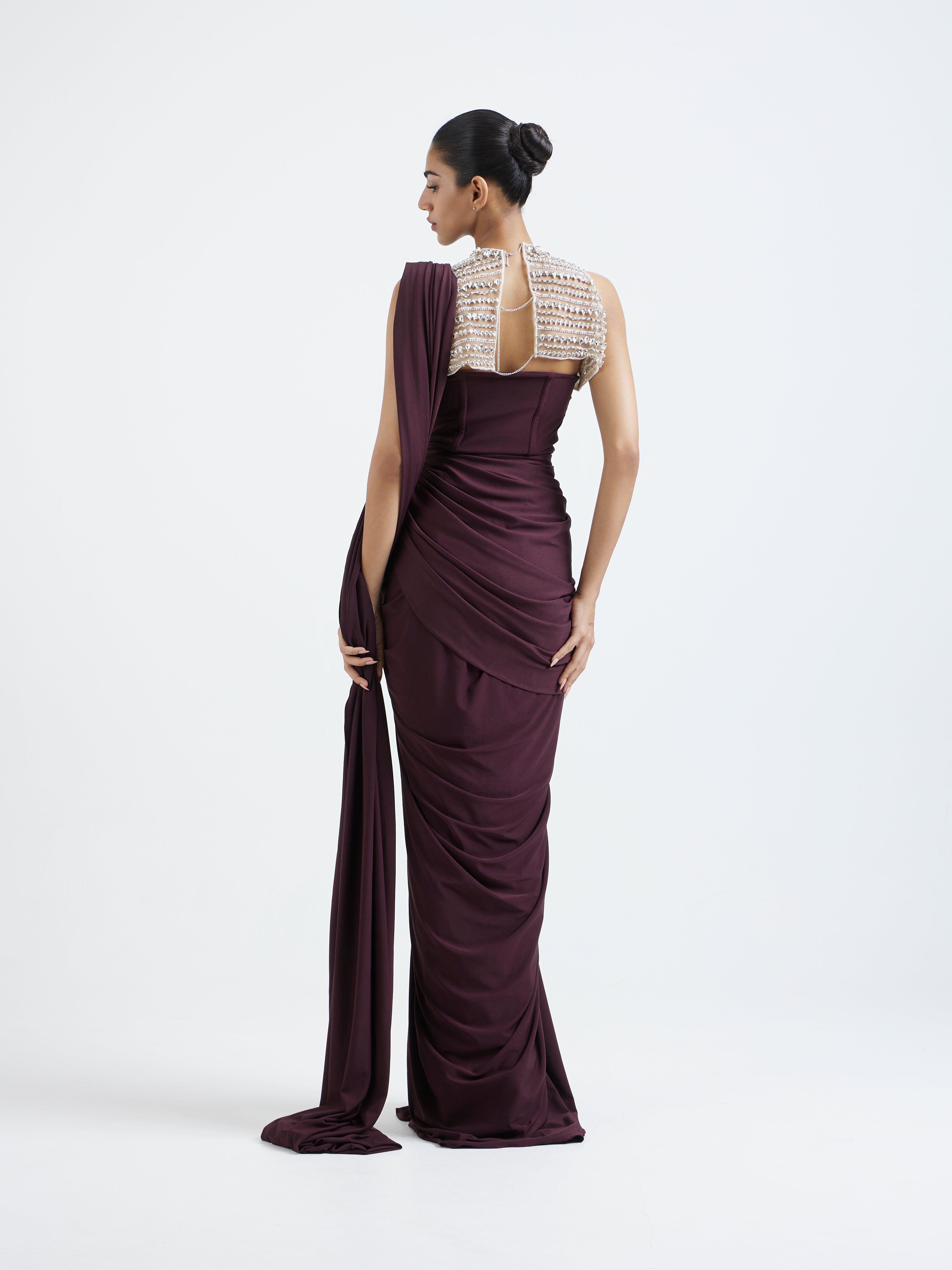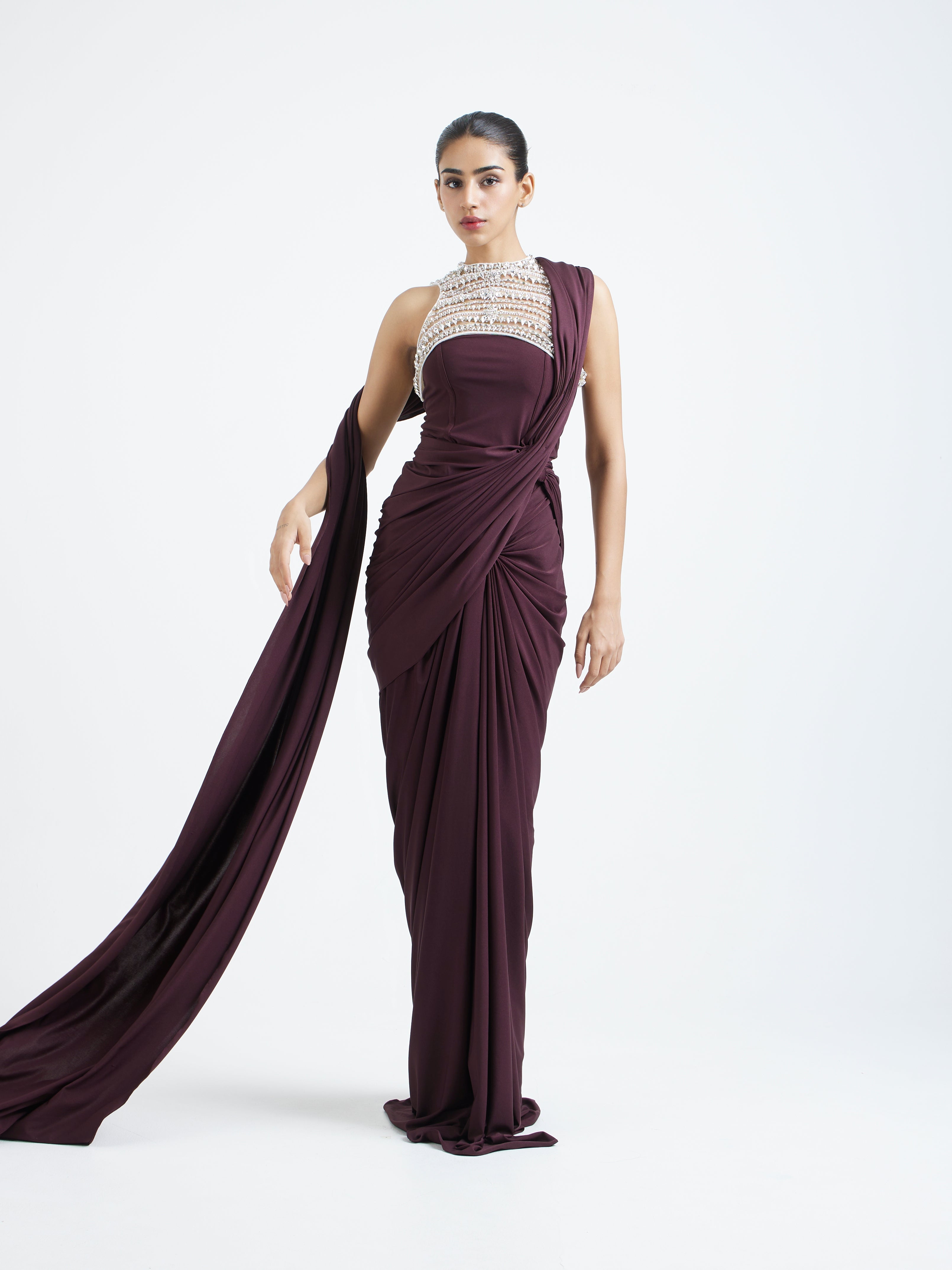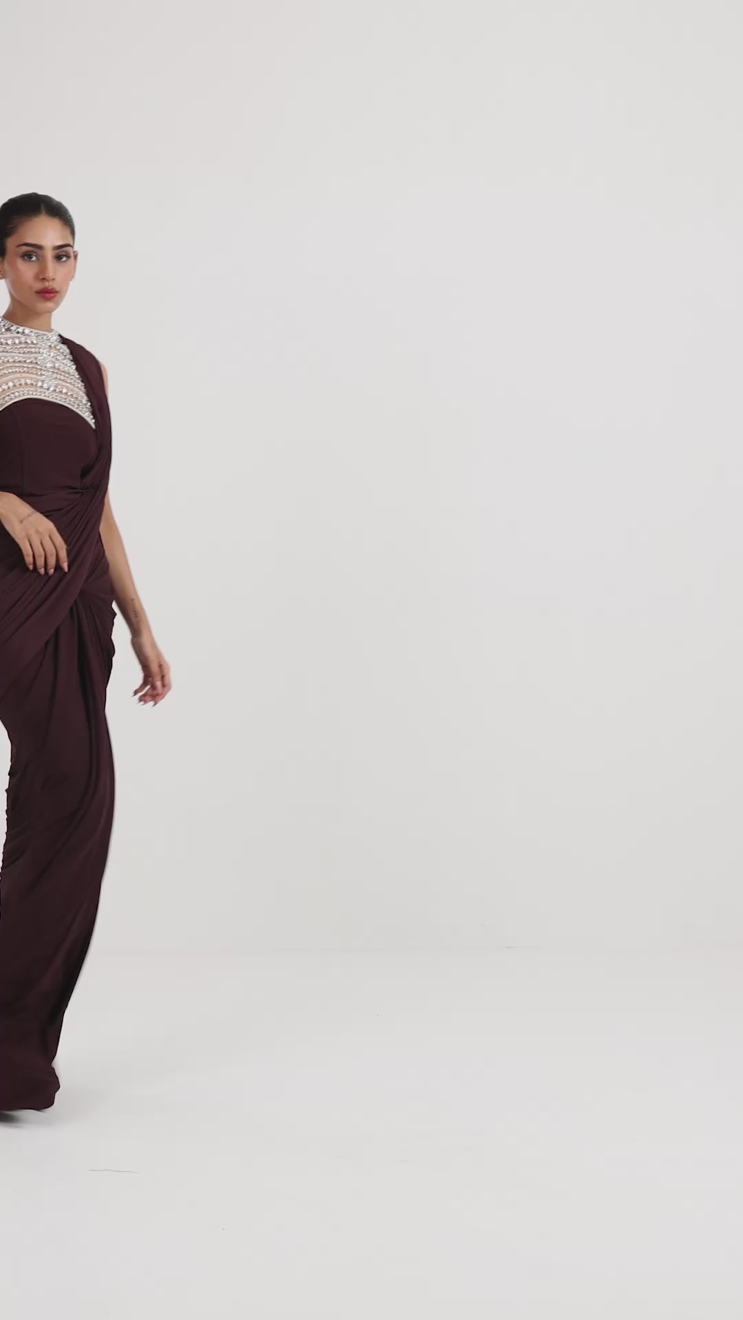 The detachable embellished overlay at the neckline adds a touch of shimmer, creating a striking contrast against the deep hue of the garment. A detachable pallu completes the look, offering the option to style it as a contemporary gown or with the graceful ease of a draped saree.