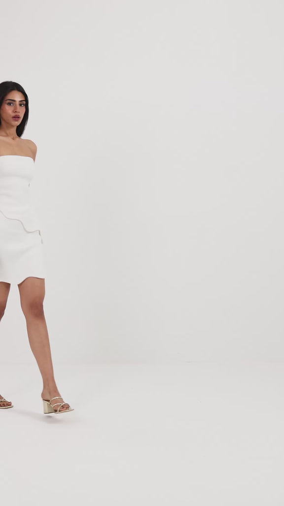 A sculpted scuba skirt and top set elevated with a dramatic, detachable feather tube wrap that adds instant couture softness. The clean, wave-hem mini skirt pairs with a sleek structured base, allowing the detachable feather wrap to take center stage.
