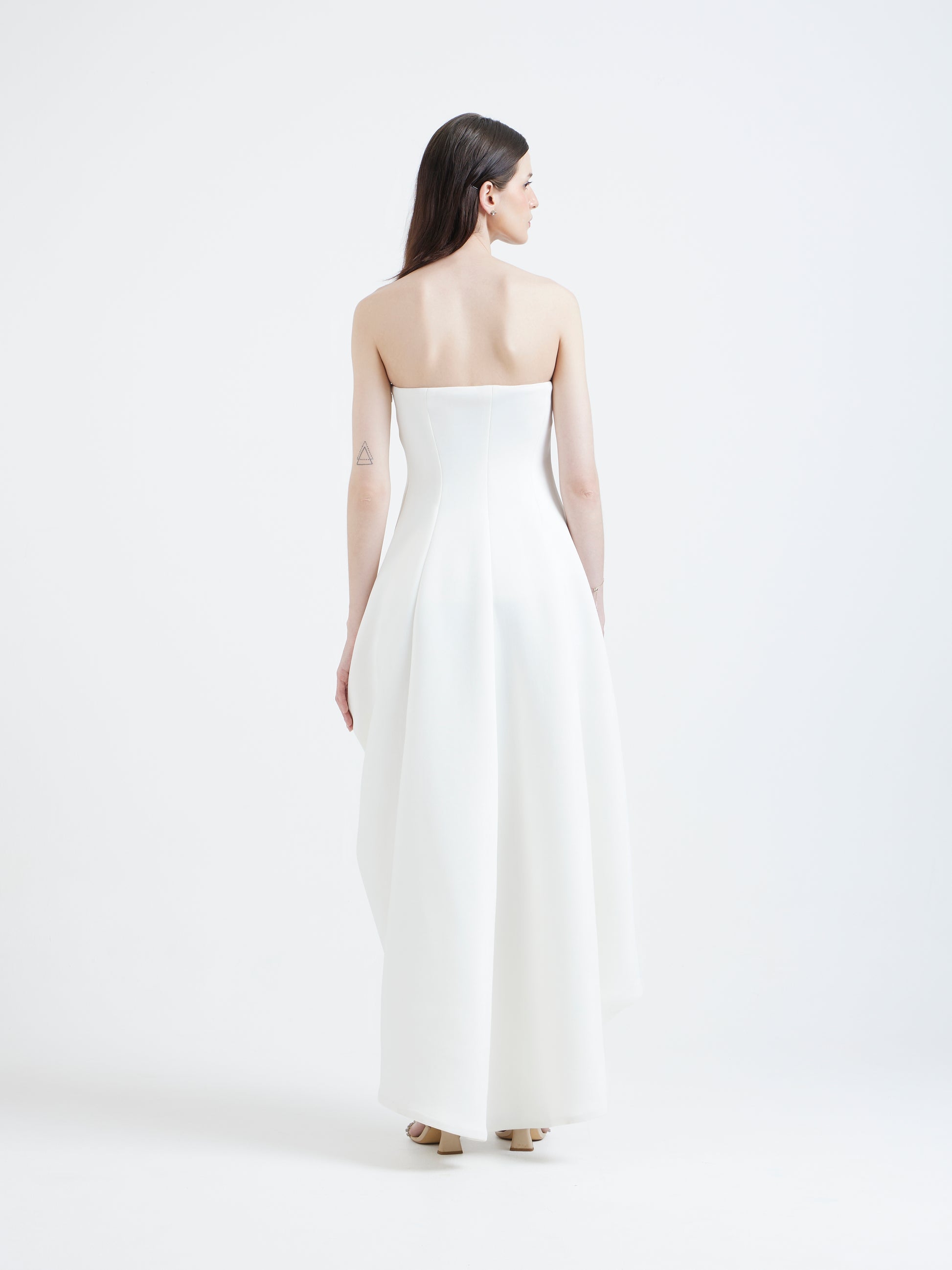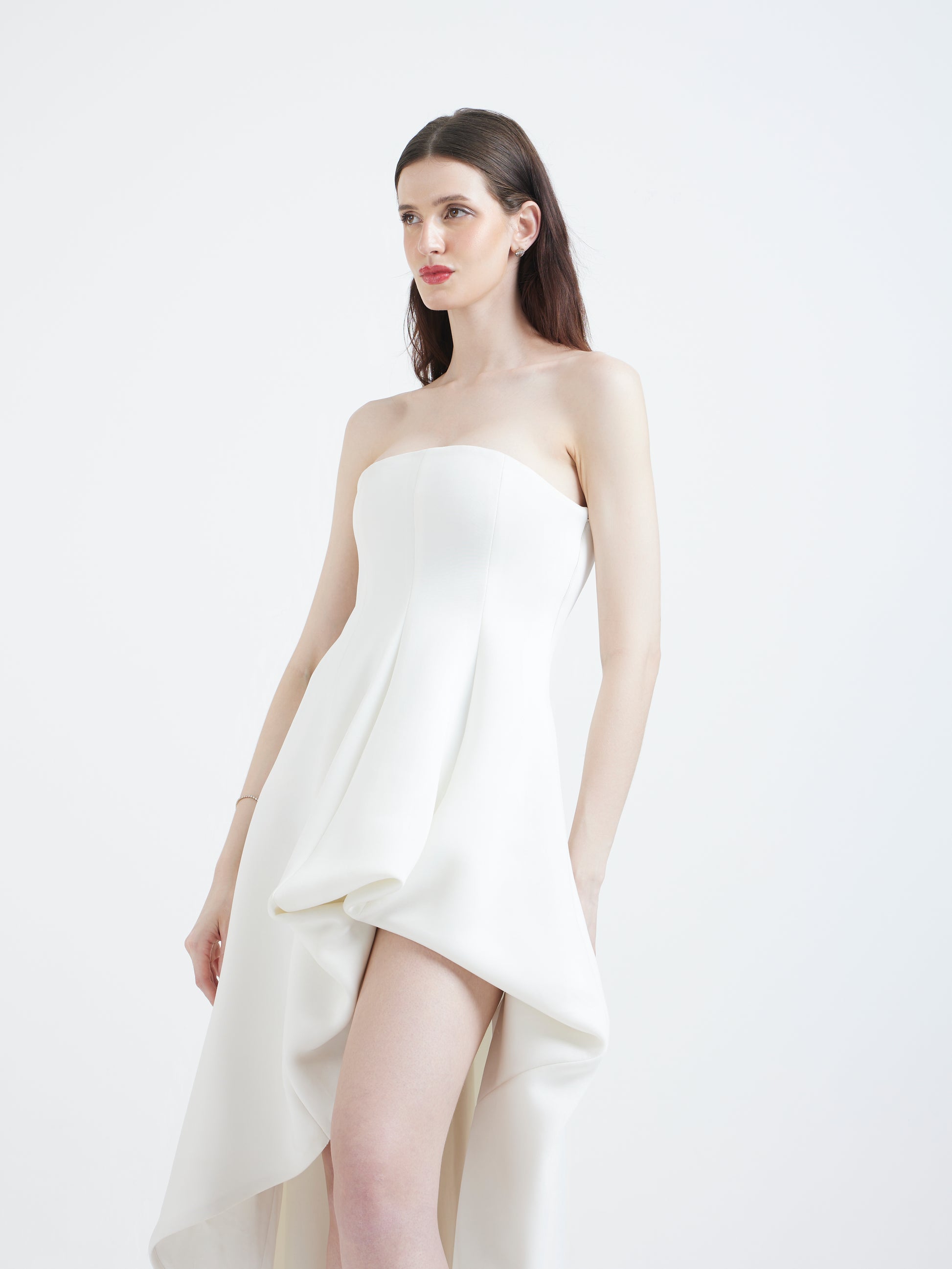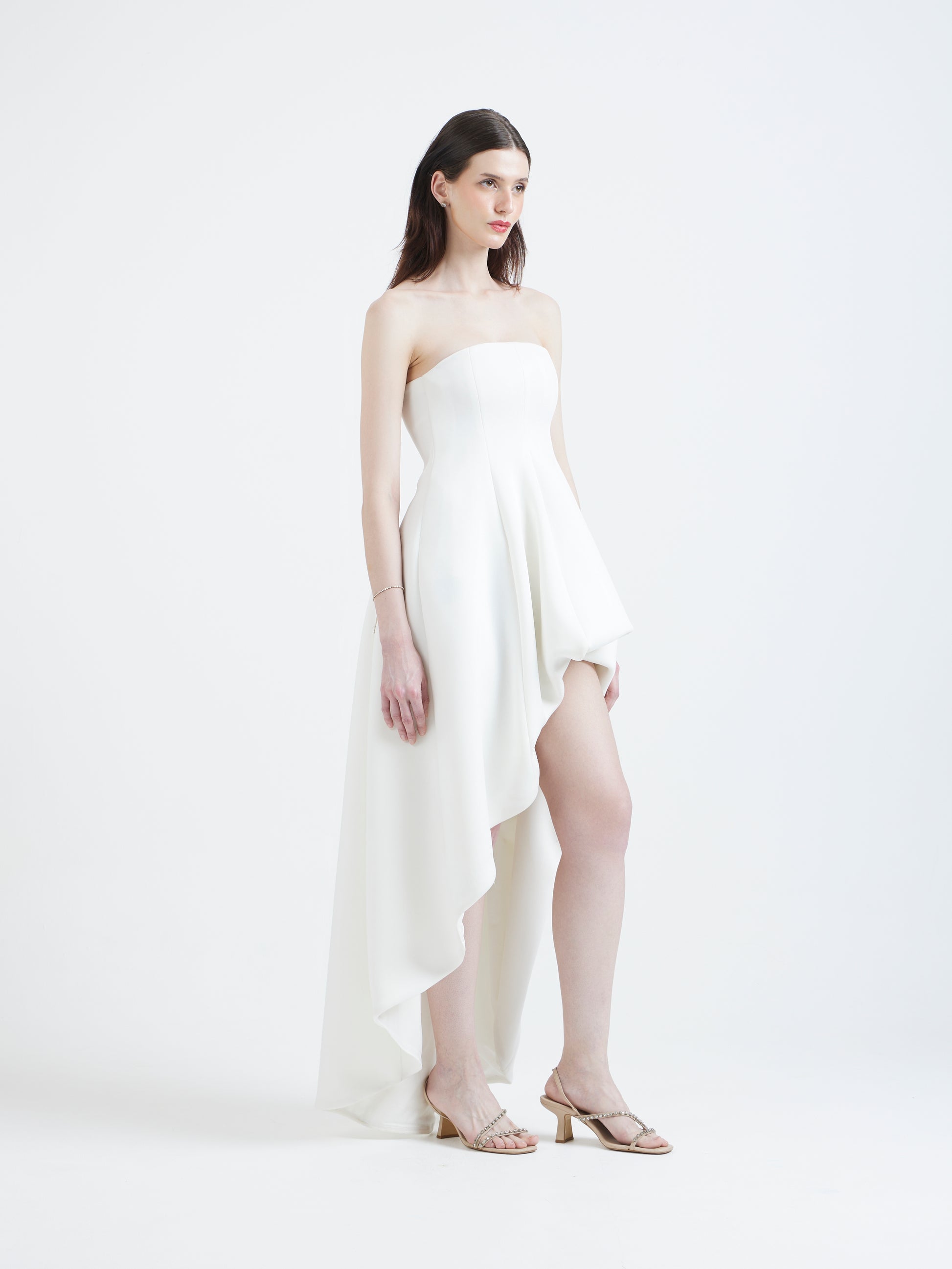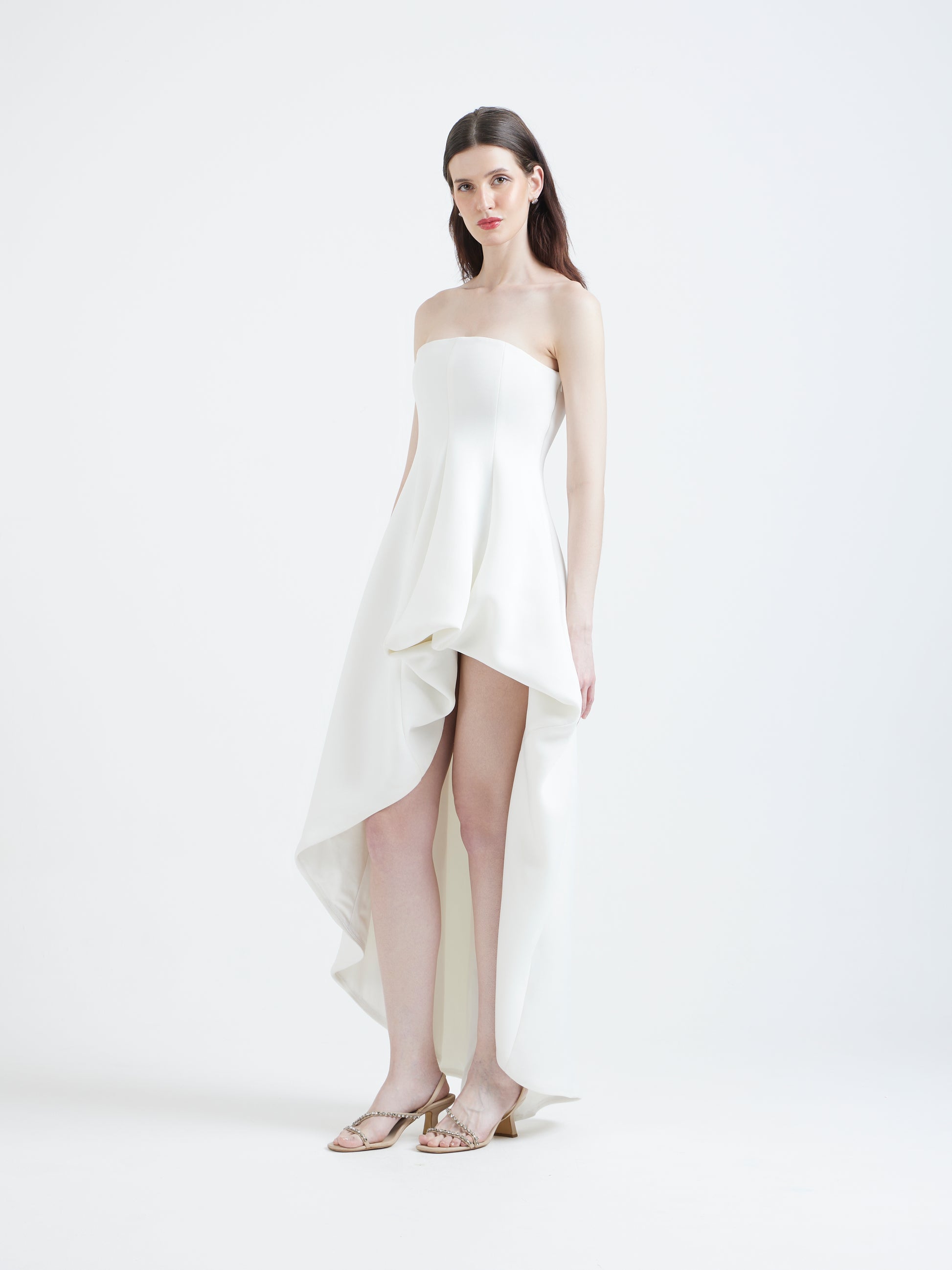 This strapless gown is built upon a sculptural silhouette using a smooth, structured fabrication, presenting an architectural yet timeless foundation.