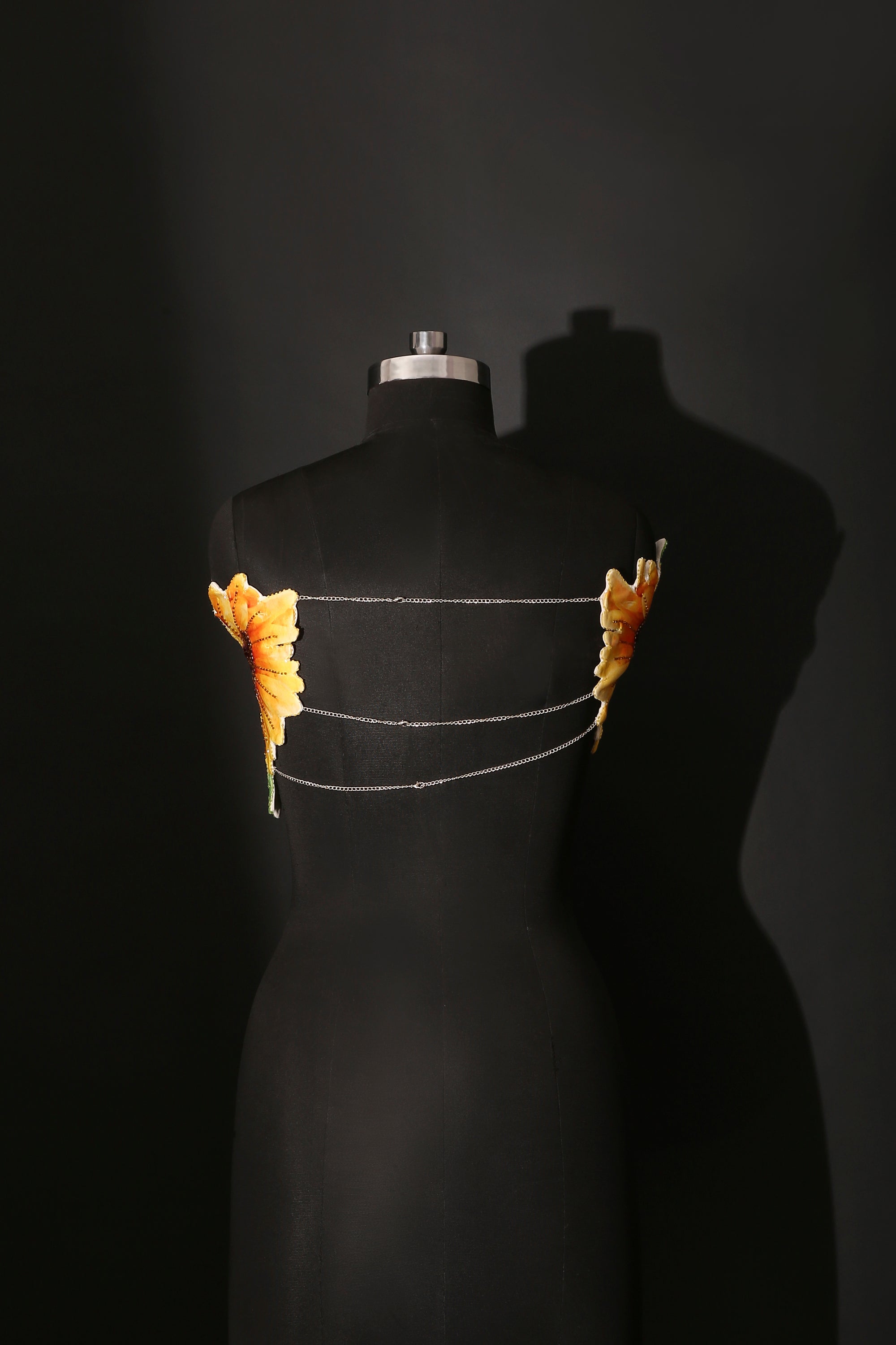 A sculpted sunflower motif printed on structured scuba, designed to sit cleanly across the neckline for a bold yet refined finish. The vivid placement brings depth and dimension, making it an effortless statement layer.